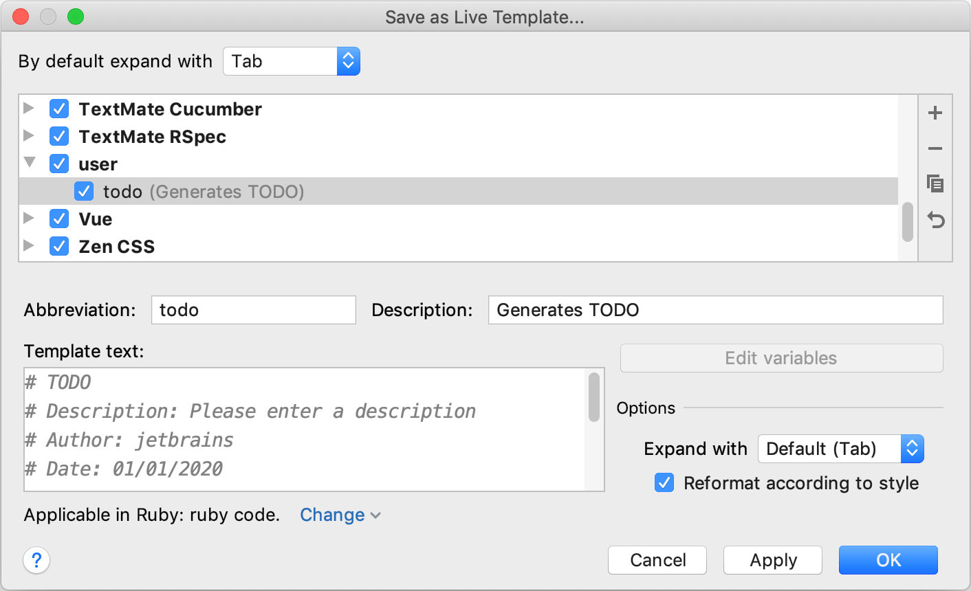 Applicable in | This read-only field shows the languages and pieces of code where the editor should be sensitive to the template. Upon pressing Ctrl+J in such context, RubyMine displays a list of templates that are valid for this context. |