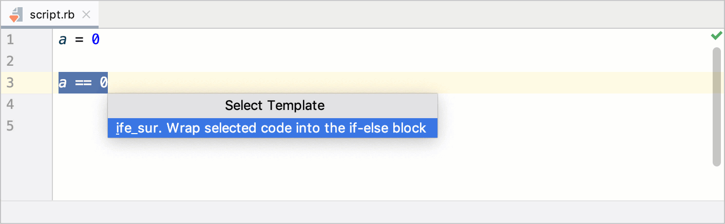 The selected code will be inserted as a condition. Use Tab to jump between variables. When you finish, the caret will be placed on the line next to the generated snippet as the