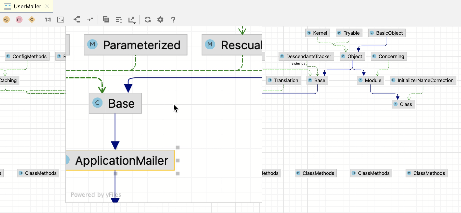 Most of the time, generated diagrams are big and complicated. Typically, you want to concentrate only on the specific part of the diagram. RubyMine lets you filter paths between two diagram elements.