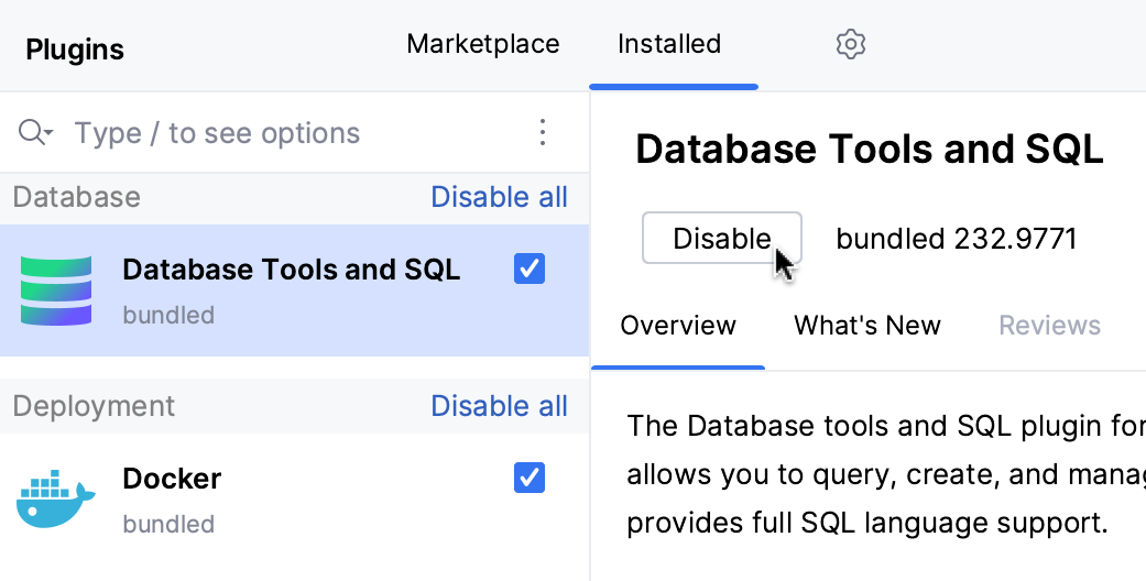 Use the Marketplace tab to browse and install plugins from JetBrains Marketplace or from a custom plugin repository.