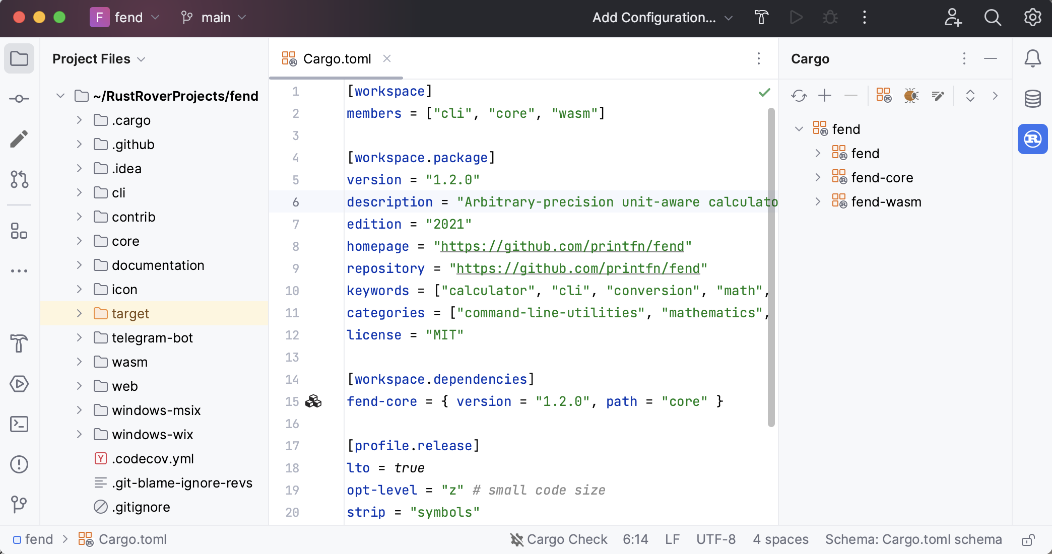 The Cargo tool window provides convenient access to common Rust tools such as Rustfmt and external linters. It also gives you a quick way to call Cargo commands, reload the project model, and run project targets.