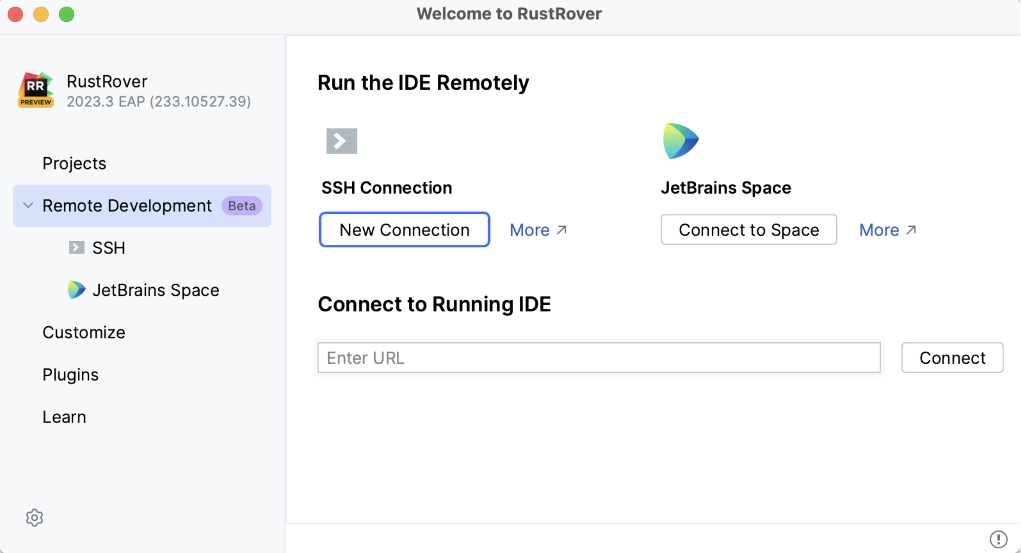 On the RustRover welcome screen, select Remote Development. Alternatively, go to in the main menu.