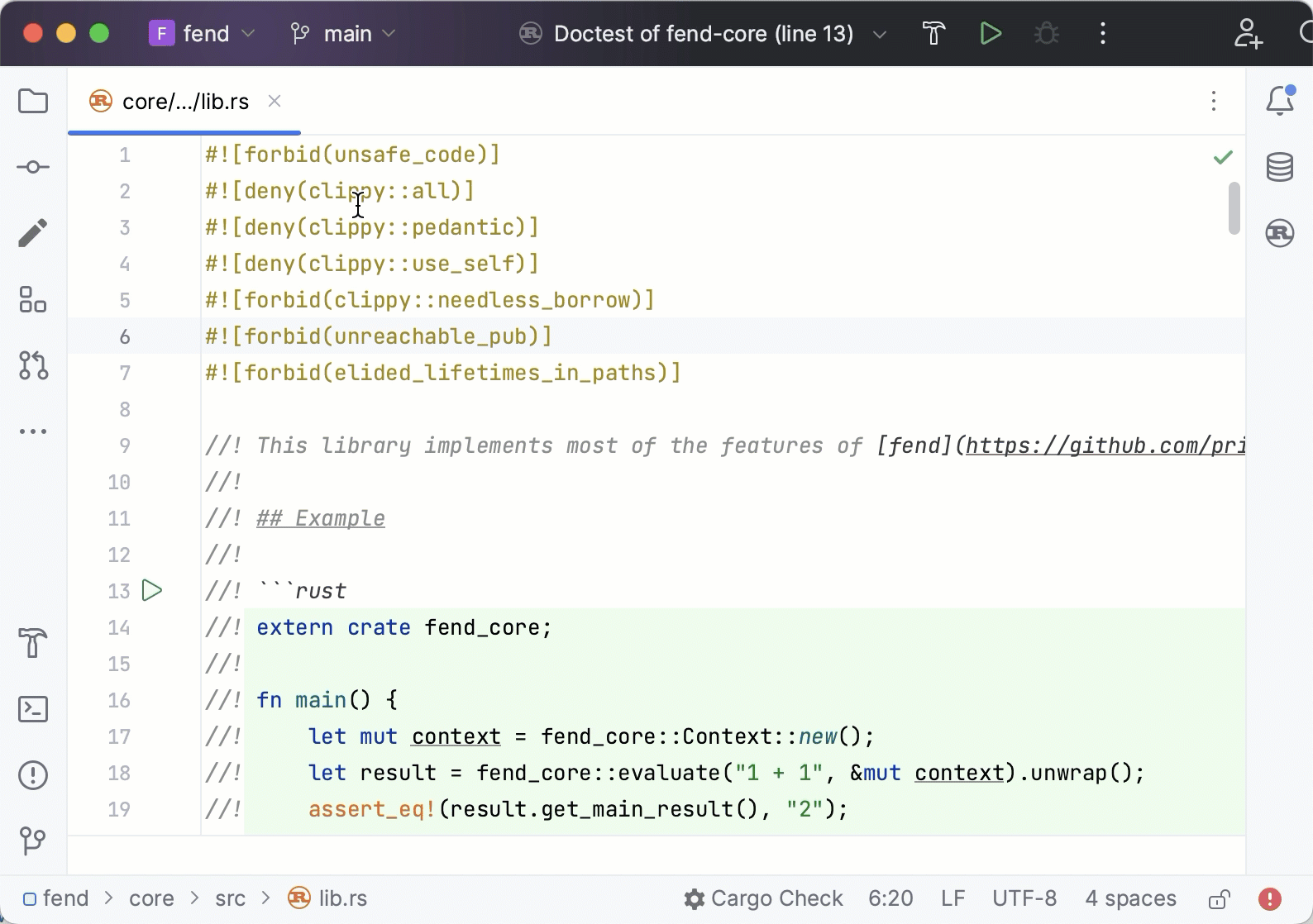 RustRover automatically detects doctests. You can run them using the methods described below.