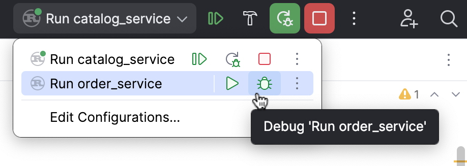 Starting a debugger session is very similar to running the program in normal mode. The debugger is attached behind the scenes, so you don't have to configure anything specific to start a debugger session. If you are able to run your program from RustRover, you will also be able to debug it using the same configuration.