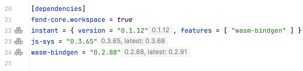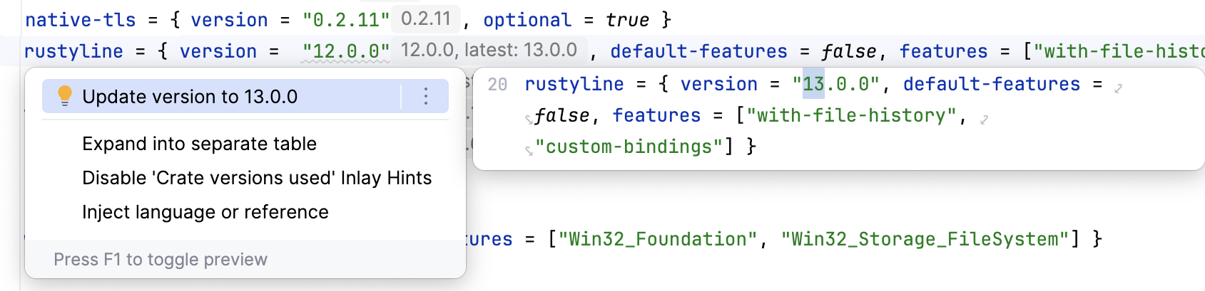 In Cargo.toml, you will see special hints alongside crate versions. These hints indicate the crate's version currently recorded in Cargo.lock as well as latest one (if available).