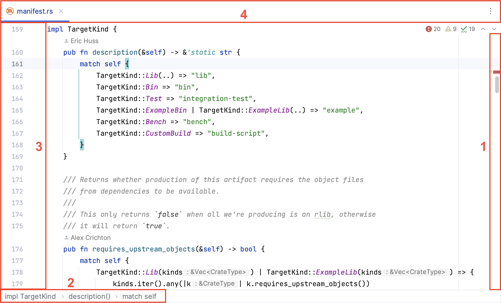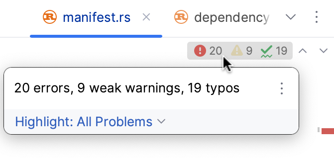 The stripes on the scrollbar indicate places where RustRover found a problem. Hover over a stripe to see a tooltip describing the problem, or click the stripe for quick navigation.