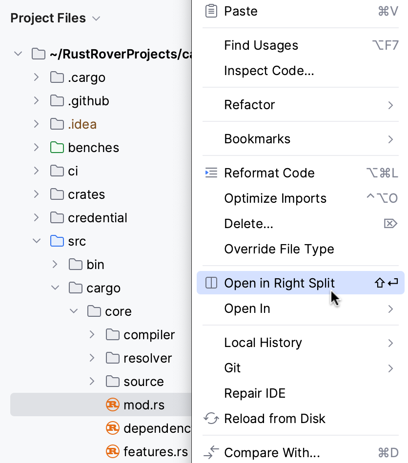 In the Project tool window, right-click the file and select Open in Right Split from the context menu. RustRover will open the file in the split on the right of the editor.