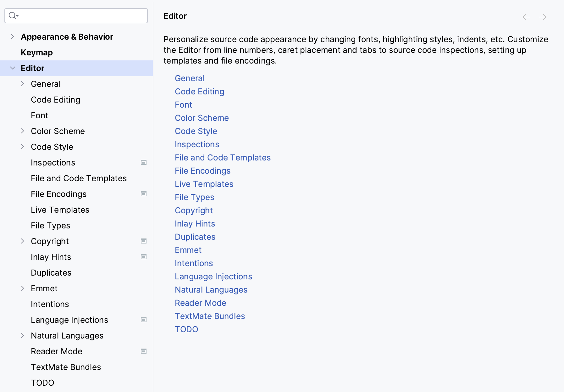 You can use the Editor section of the Settings dialog (Ctrl+Alt+S) to customize the editor's behavior.