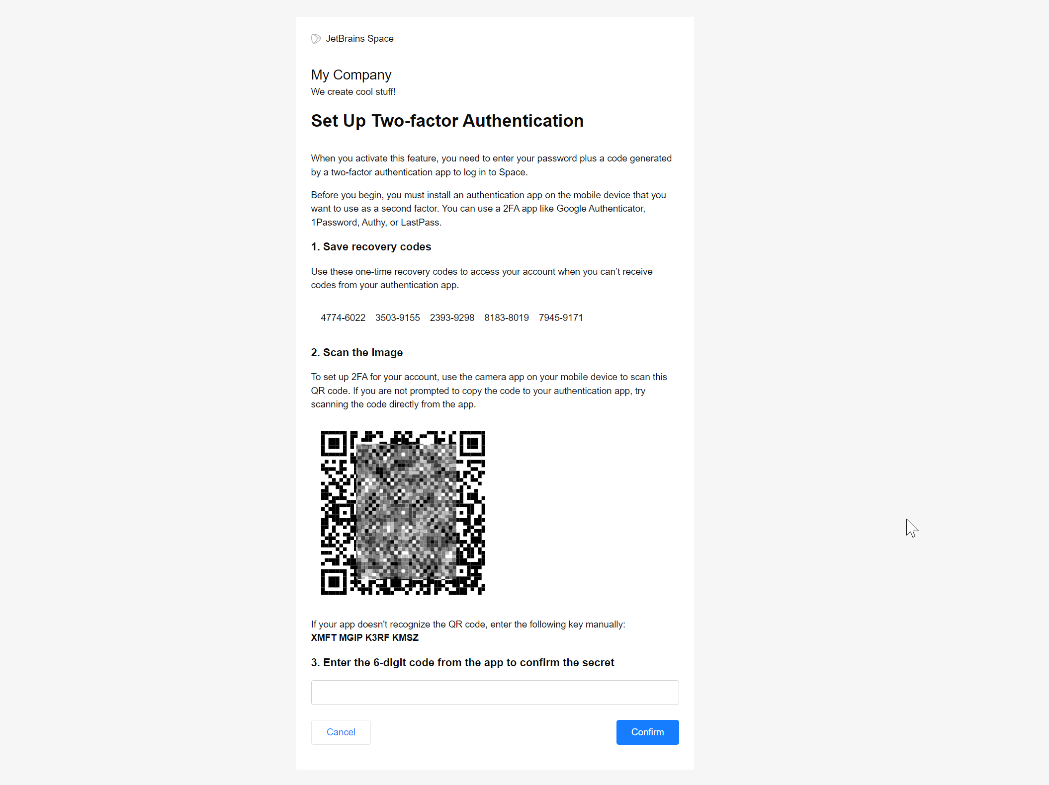 You can enforce two-factor authentication policy by requiring users with certain roles to set up 2FA for their accounts. With the 2FA requirement enabled, users won't be able to log in to SpaceCode until they provide a security code generated by a two-factor authentication app that users need to install and set up.