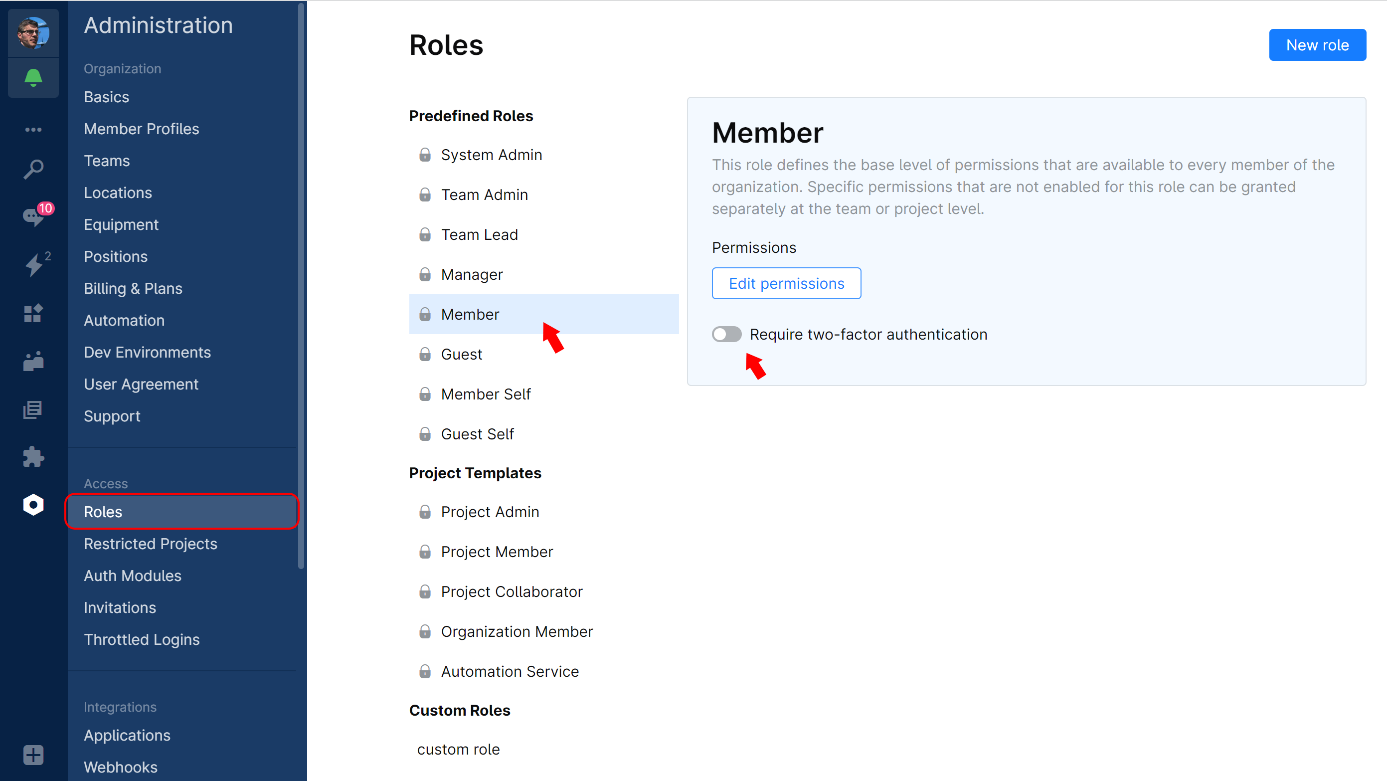 Administration and choose Roles.On the left pane, choose the role you want to set the 2FA requirement for and turn on the toggle Require two-factor authentication:
