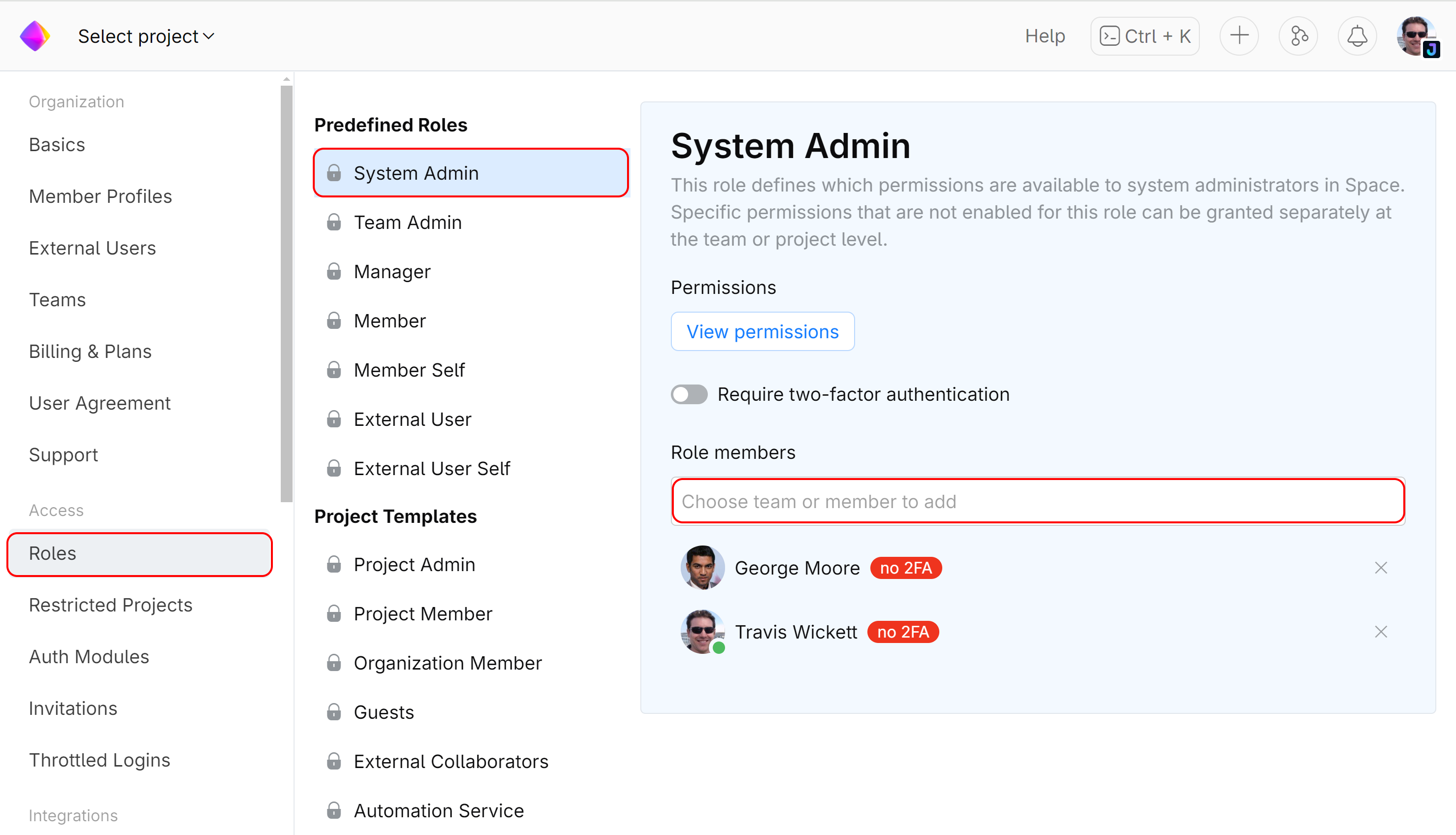 However, System Admin can modify templates for the predefined project-specific Roles (permission sets) by adding or removing permissions from them. The role templates can be then used by Project Admins as predefined Roles to assign those Roles to their project participants. A Project Admin can override the template configuration in his or her project by editing predefined Roles or creating new Roles .