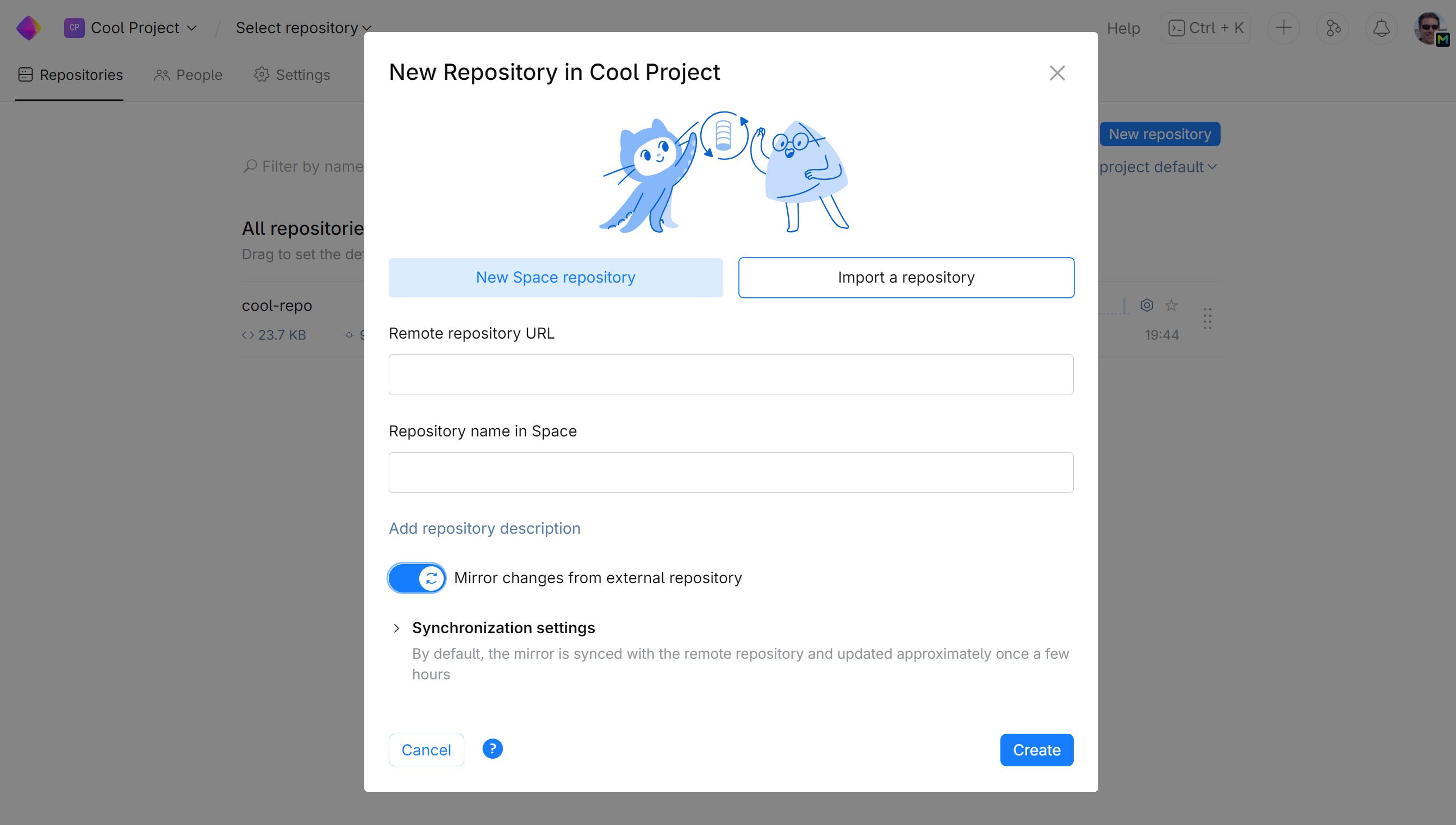 Create a synchronized copy of an existing remote repository from external Git hosting.