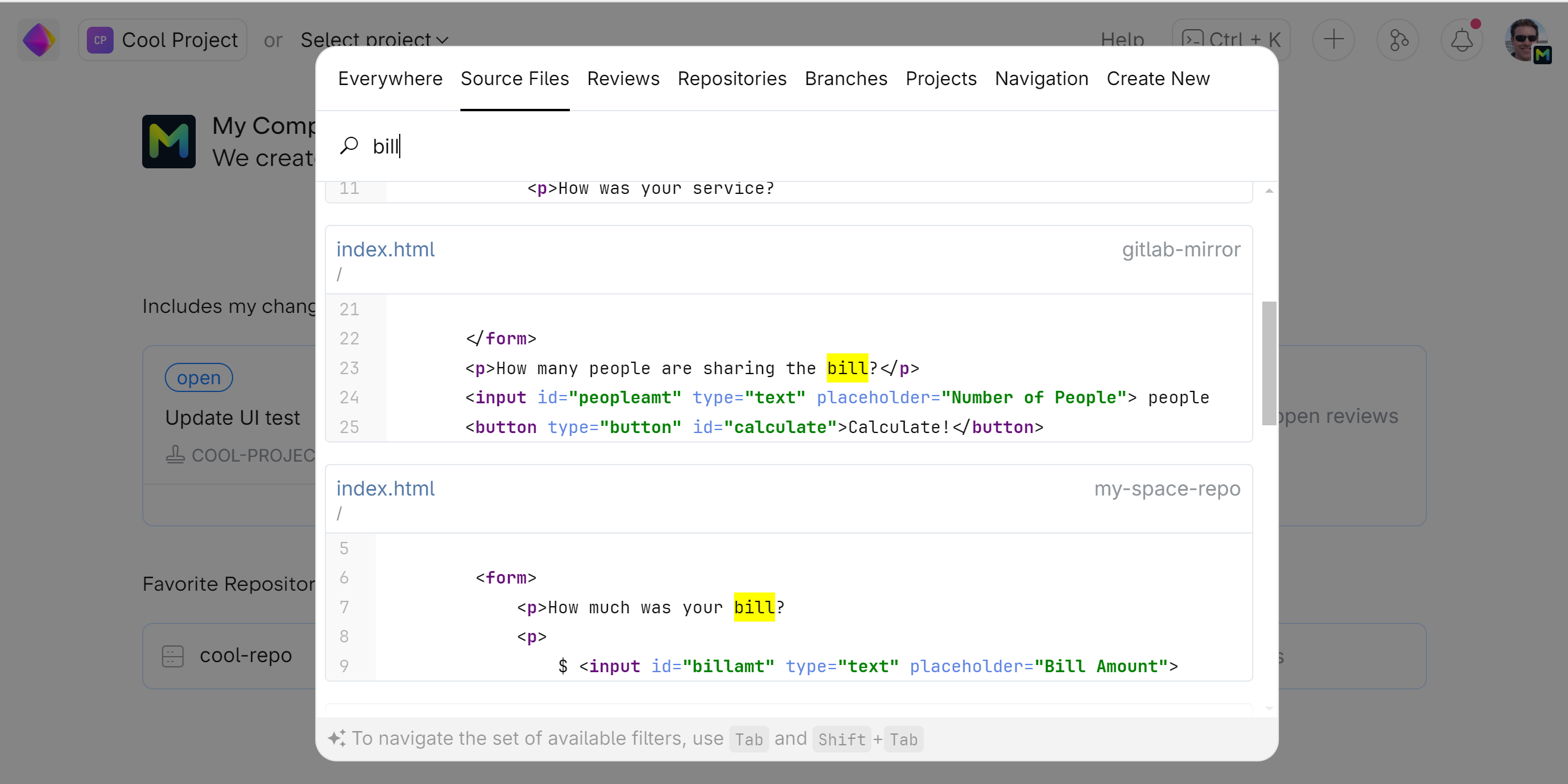 Press Control+K to quickly find: entities, such as projects, repositories, people