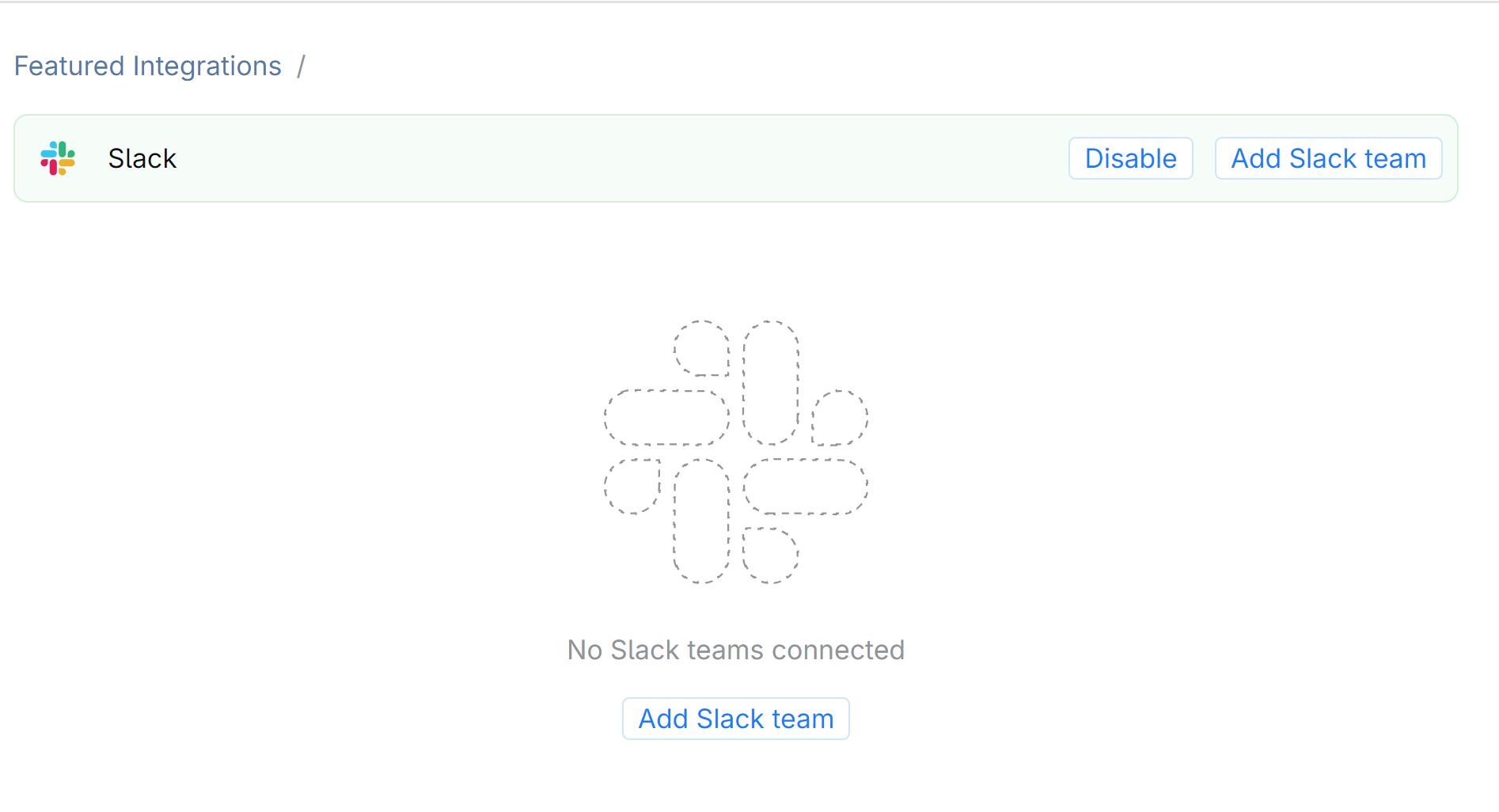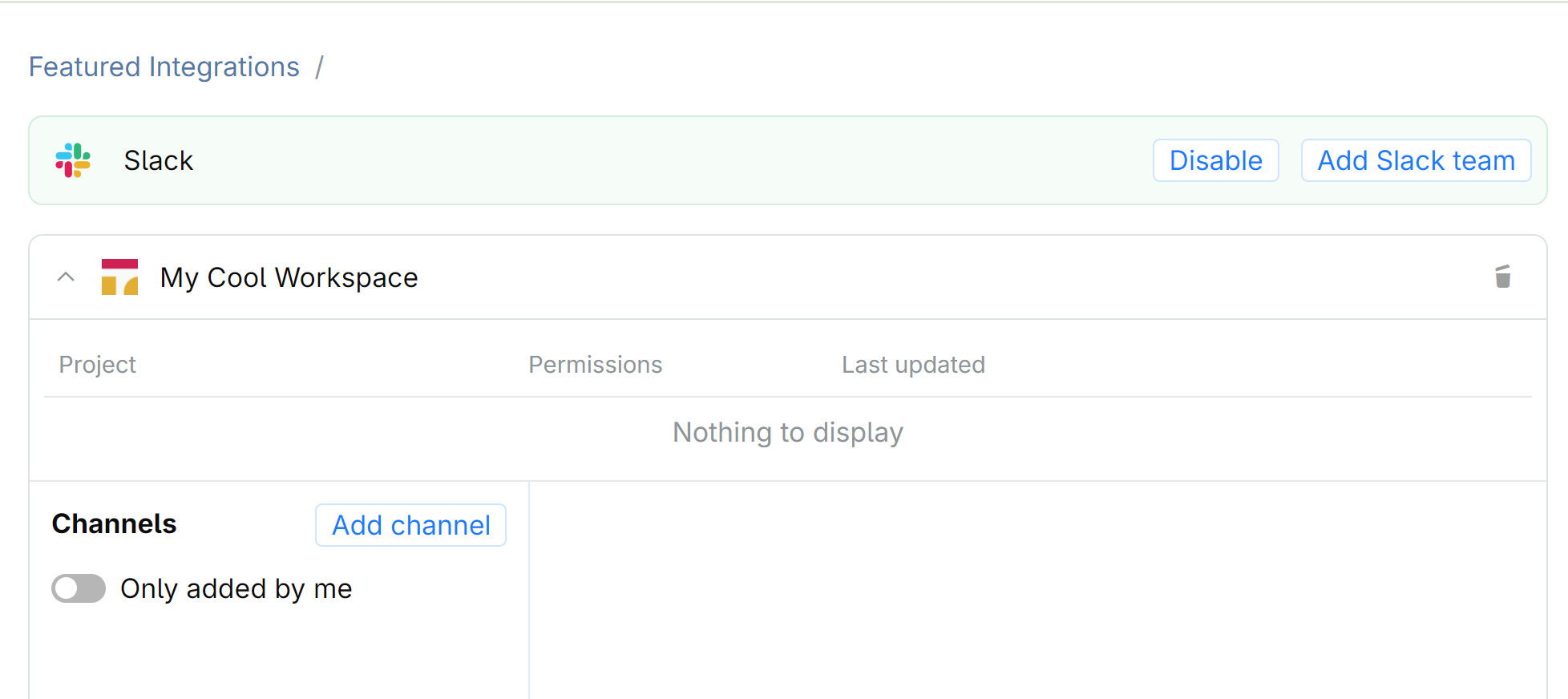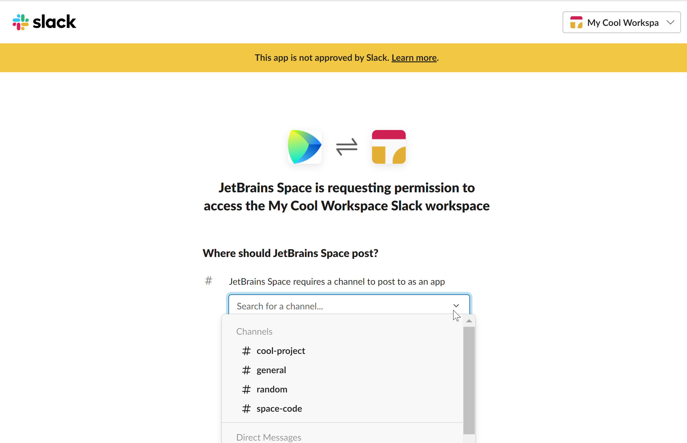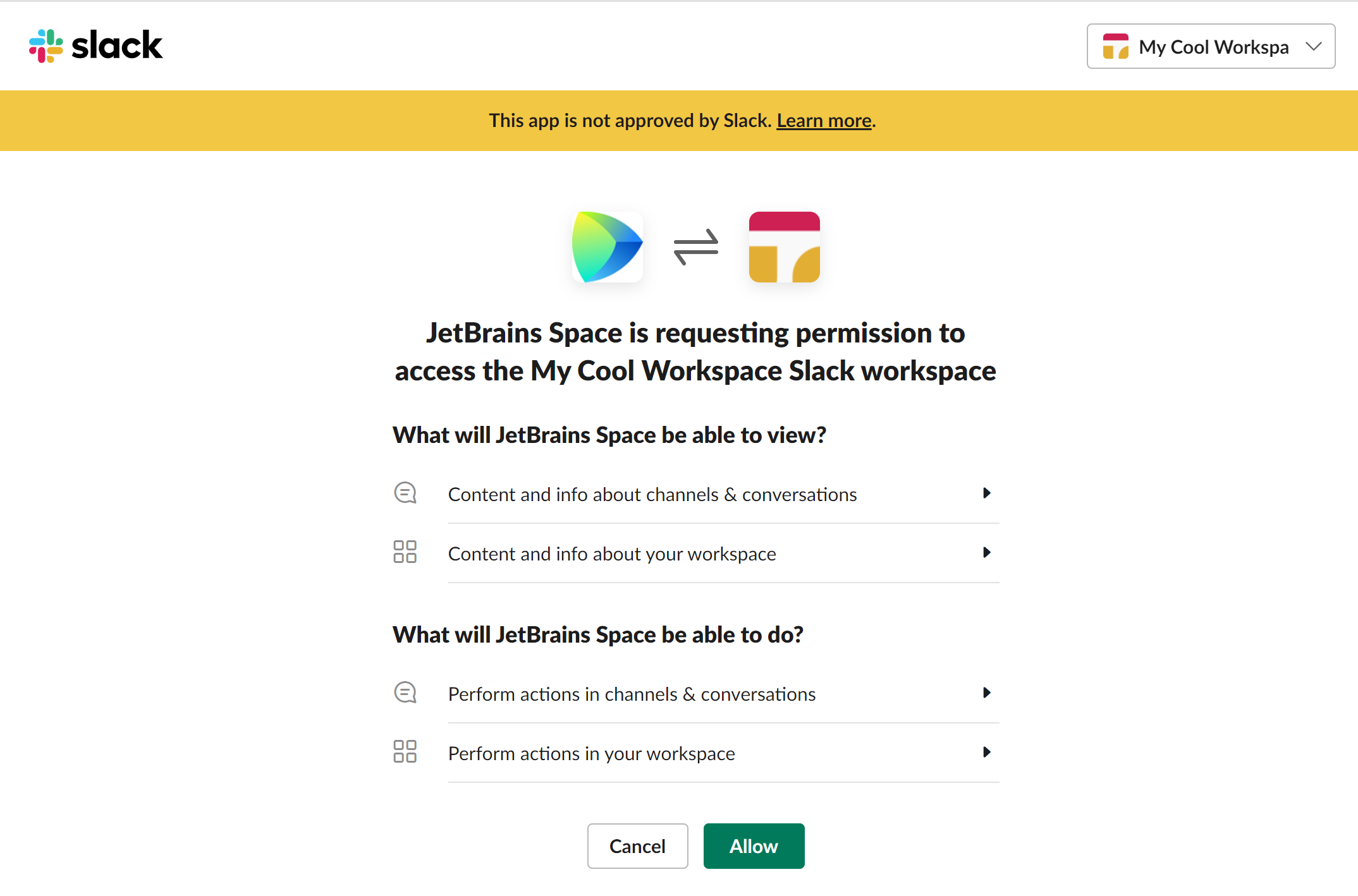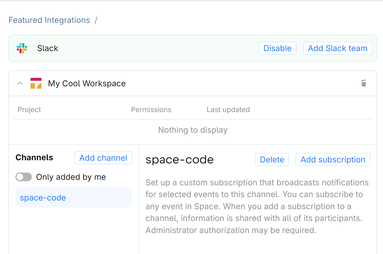 A SpaceCode application will be added to your Slack workspace, and you Slack workspace name will appear on the integration page in SpaceCode.