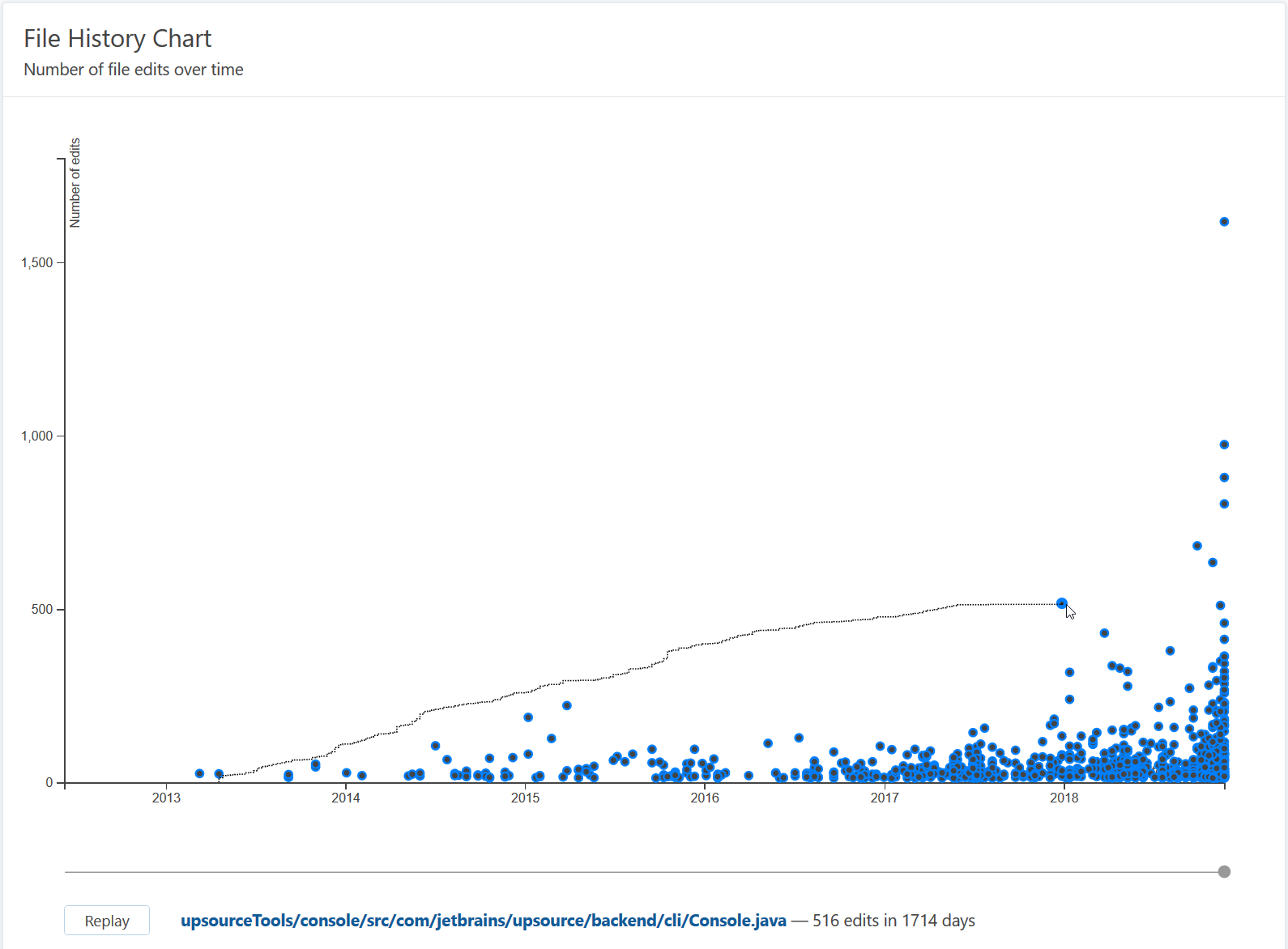 This chart shows you how a project evolves over time. Each dot represents a file (hover over it to see its name), horizontal axis shows the date of the latest commit, while vertical axis shows the total number of commits. Knowing which files are edited the most can help you better understand your project. Only the 1000 most edited files are shown.