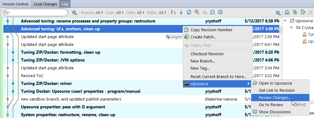 2. Select one or more revisions you want to include in the review then choose Upsource|Review Changes from the context menu: