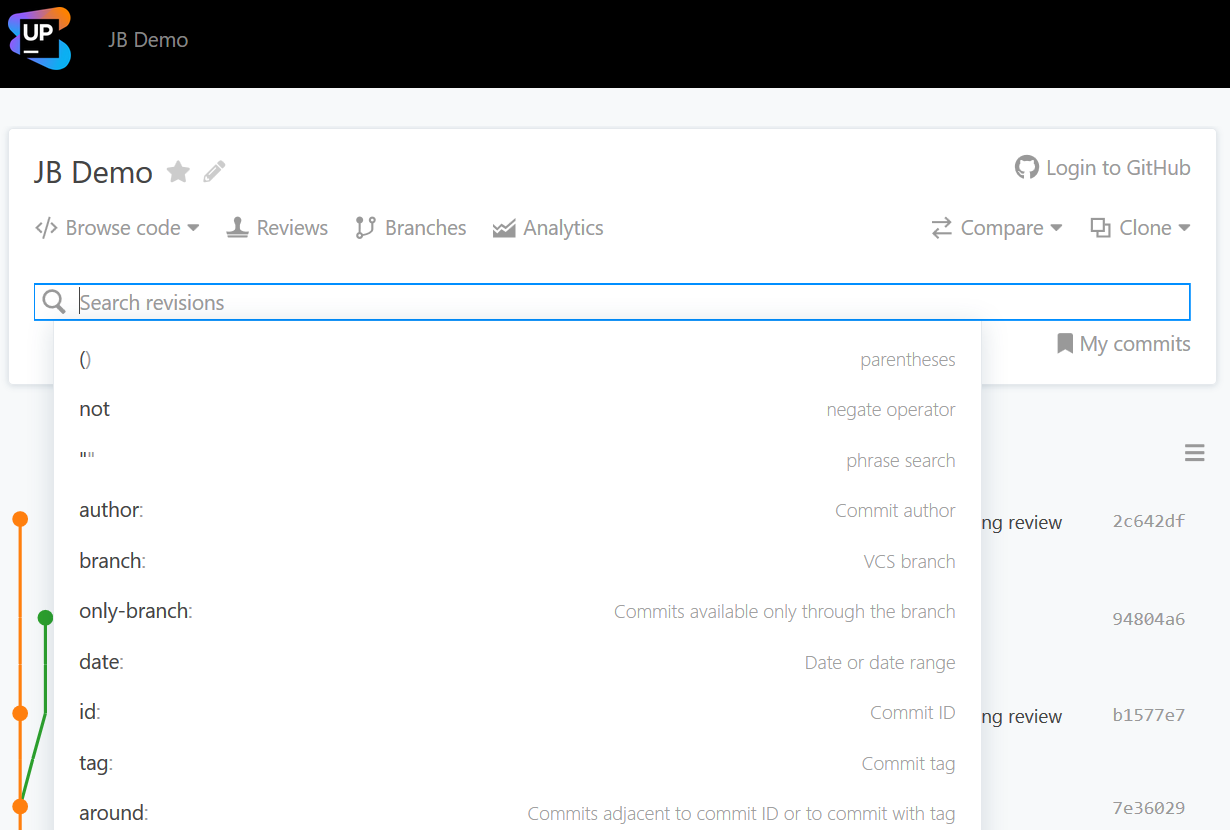 Commit message | Type in one or more words you expect the commit message to contain. You can also specify discrete phrases in quotation marks. | |