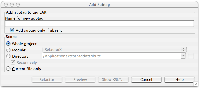 The Add Subtag refactoring allows you to add a subtag to a set of XML tags. If this refactoring is invoked, subtags matching the requested subtag name will be added to tags with the selected tag name. Optionally, the requested subtag may be added only to tags that do not already contain the selected subtag. This bulk addition of subtags is useful as XML schemas evolve.
