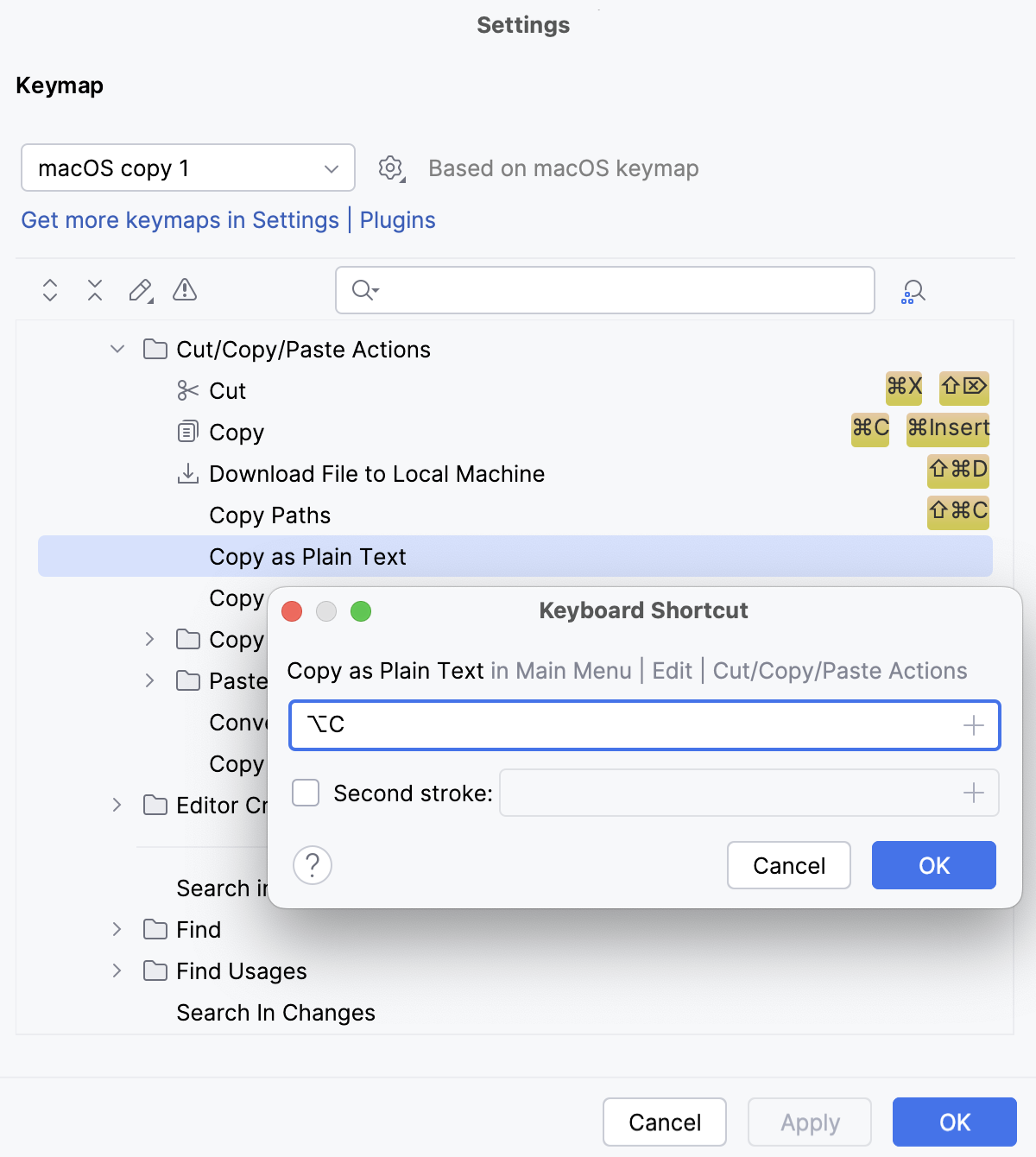 A keymap is a list of actions with corresponding keyboard and mouse shortcuts and abbreviations. You cannot change predefined keymaps. Instead, when you modify any shortcut of a predefined keymap, WebStorm creates a copy of that keymap, which you can configure. Click to duplicate the selected keymap, rename, remove, or restore it to default values. For more information about keymap files, refer to Location of user-defined keymaps.