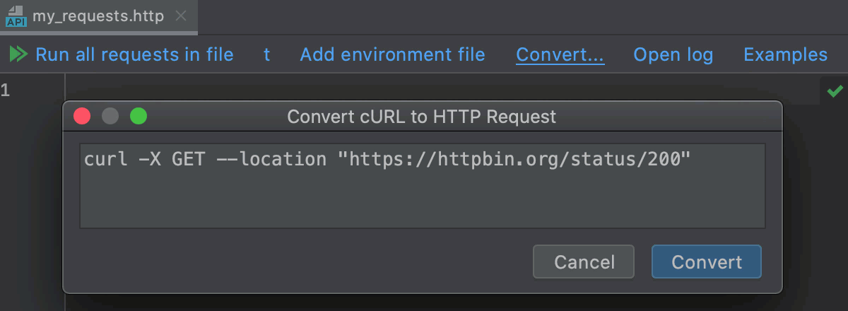 If you are working with cURL requests, you can convert between cURL requests and the HTTP request in Editor format.