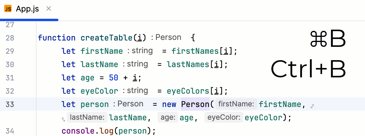 Alternatively, keeping Ctrl+Shift pressed, hover over the symbol. When the symbol turns into a hyperlink, its type declaration will be displayed in the tooltip. Click the hyperlink without releasing the keys to open the type declaration of the symbol in the editor.
