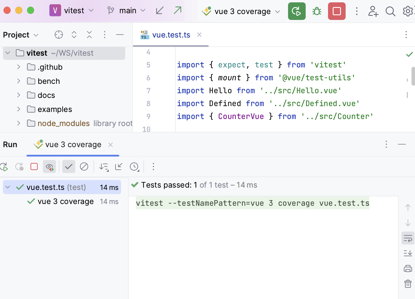 The VCS widget shows the current branch, allows switching branches, and provides access to essential VCS actions like update, commit, and push changes.