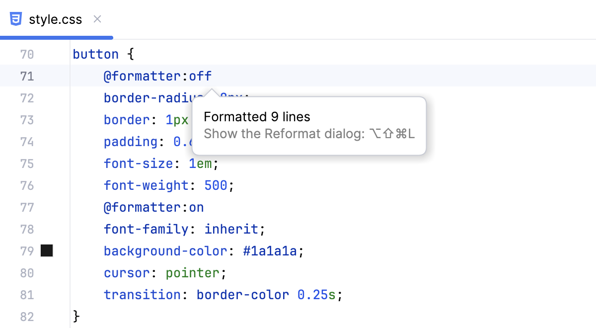 The original formatting of the code inside the markers (line 72 - line 76) is preserved while the code without markers (line 78 - line 81) is reformatted:
