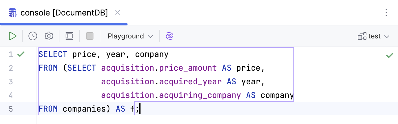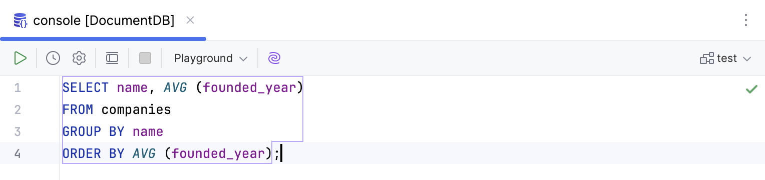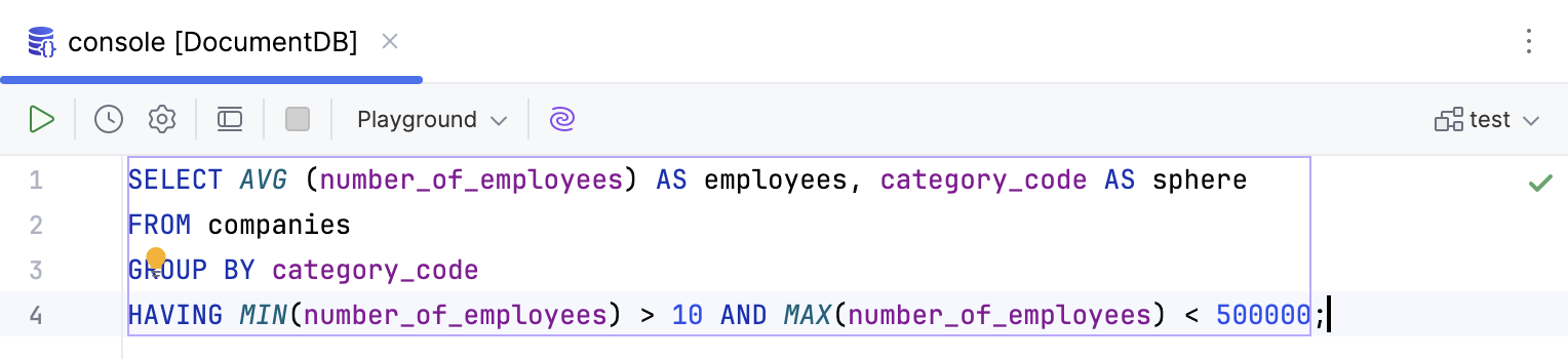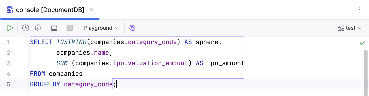In MongoDB and Amazon DocumentDB, to manipulate data or perform other operations, you write scripts for the mongo shell in JavaScript. For developers who query data primarily with SQL, it might be helpful to use SQL for MongoDB or Amazon DocumentDB collections as well. WebStorm will translate your SQL queries to JavaScript.