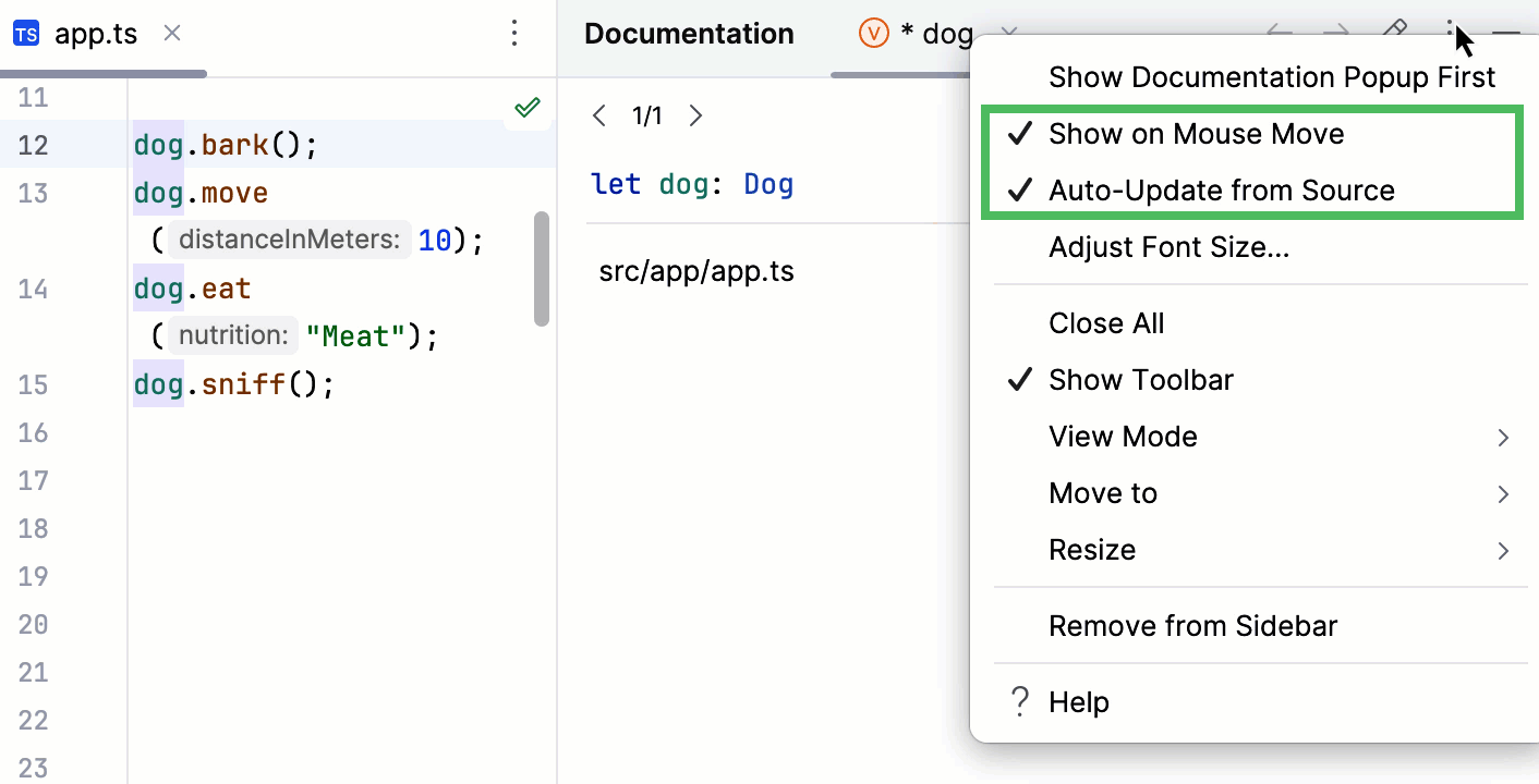 Quick Documentation Look-up lets you view reference for symbols from your project and from its dependencies as well as for standard JavaScript objects and methods. For more information, refer to JavaScript documentation look-up and TypeScript documentation look-up.