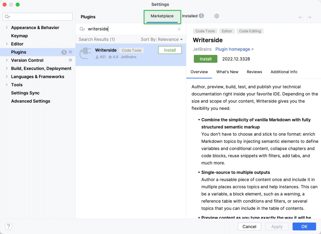 Writerside, select the plugin, and click Install.