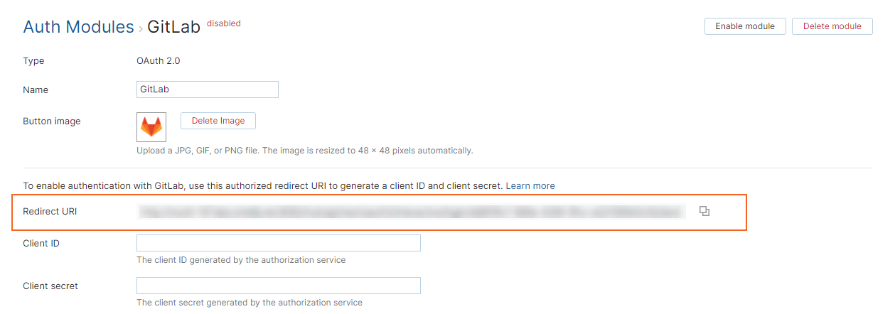 To get started, open YouTrack and create an authentication module for GitLab accounts. When you create the authentication module, YouTrack generates a redirect URI to use with the authorization service.