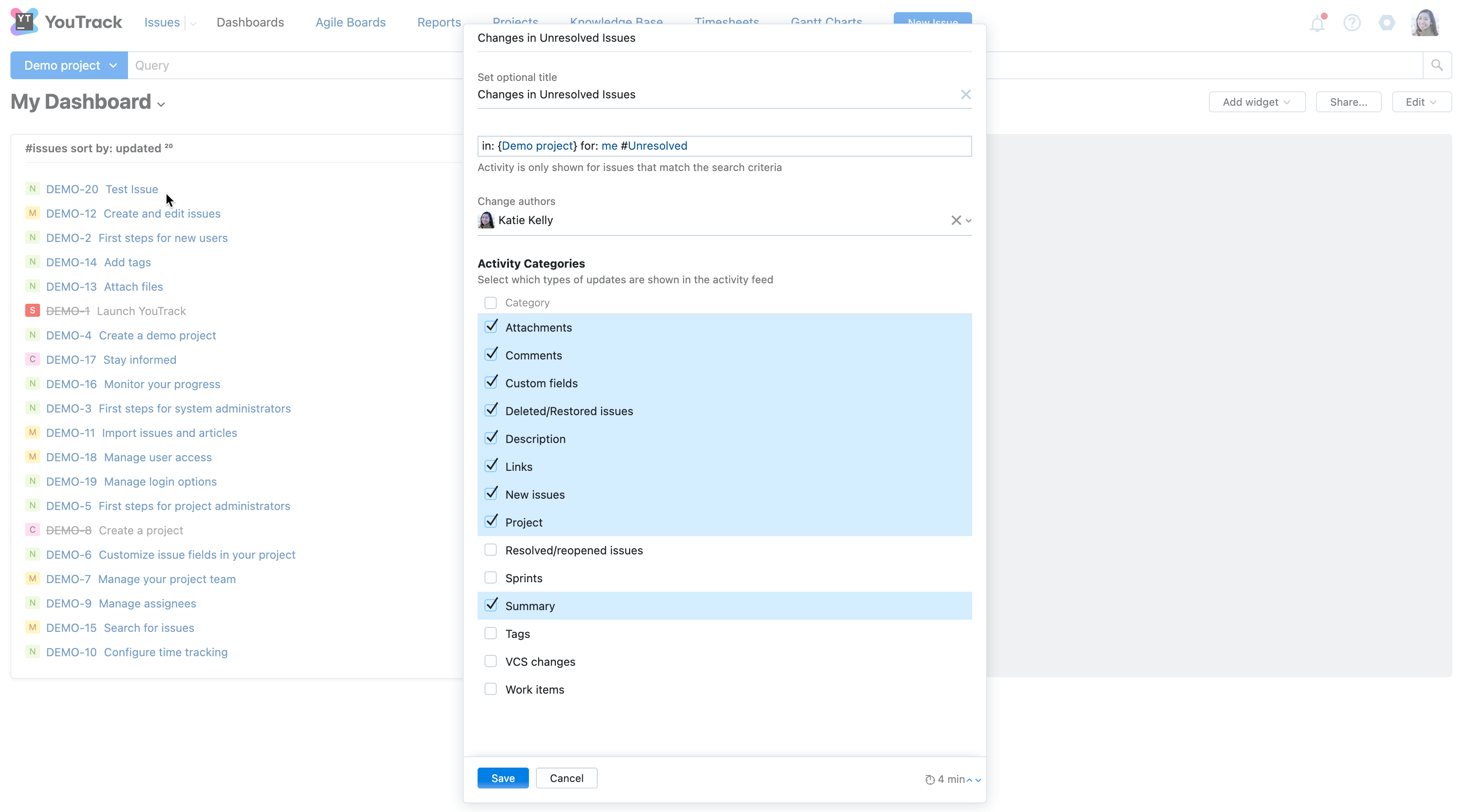 The Issue Activity Feed widget lets you monitor changes in a set of issues. The set of issues is filtered by a search query that you specify in the widget.