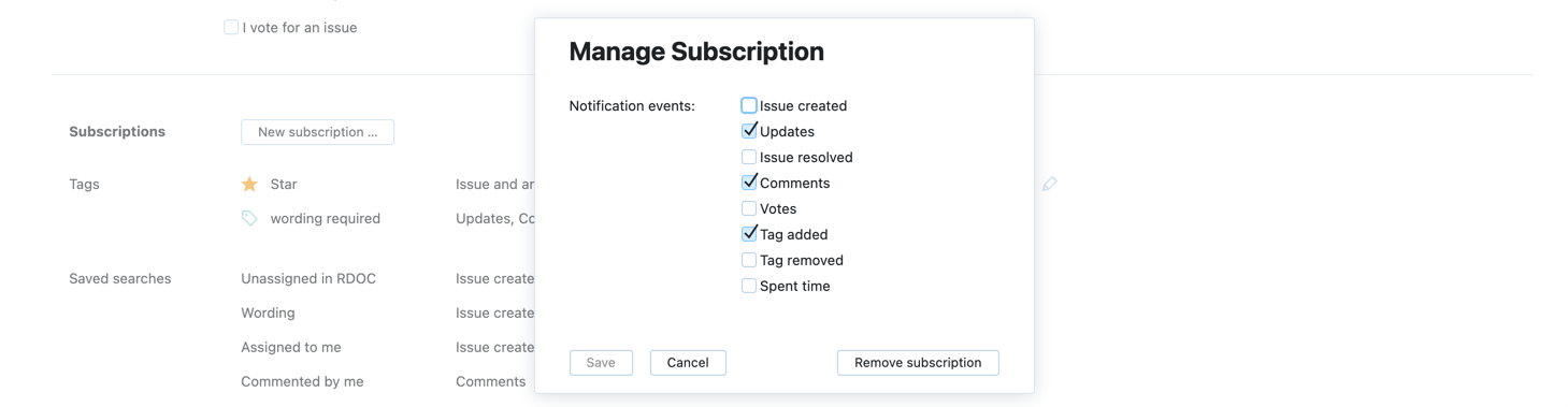 With subscriptions, you can subscribe to updates for issues with specific tags or properties that match a saved search. For each subscription, you can select the events that trigger notifications. For specific examples, see Use Cases for Subscriptions.