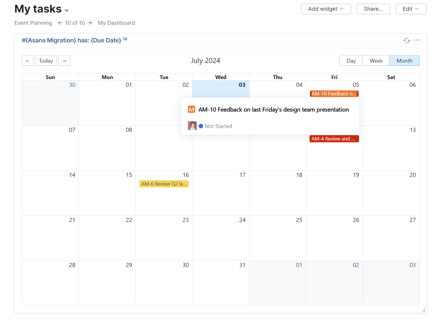 If you prefer to work with a Calendar view, you can set up a personal dashboard and track your work using a due date calendar widget.