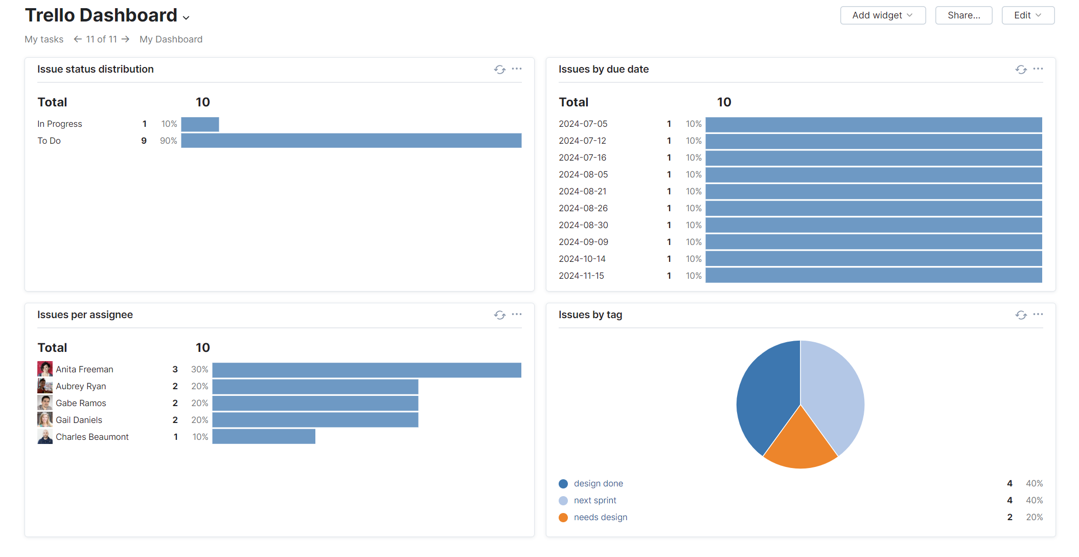 If you're a fan of Trello's Dashboard view, you can set up something similar with a dashboard in YouTrack.