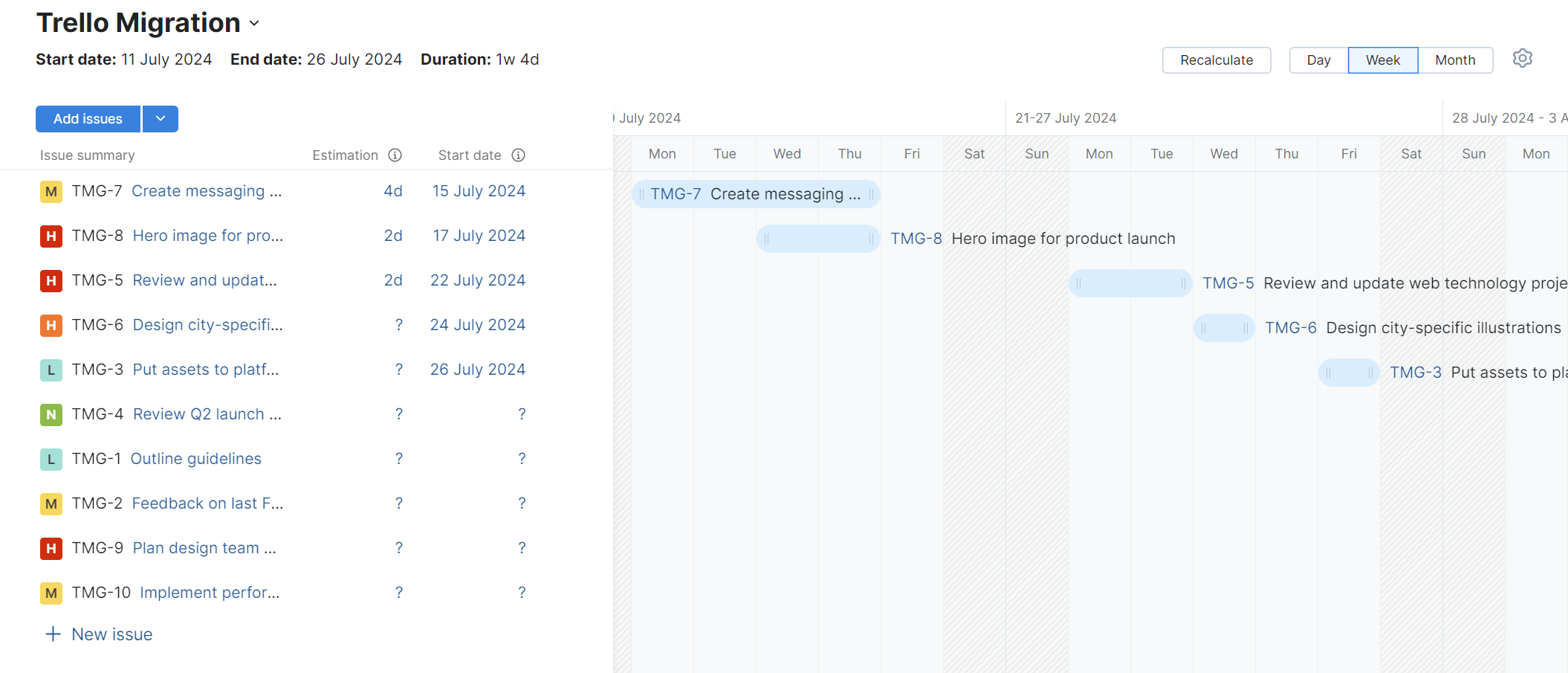 If you're used to working with cards in Trello in Timeline view, you can opt to manage your YouTrack issues on a Gantt chart.
