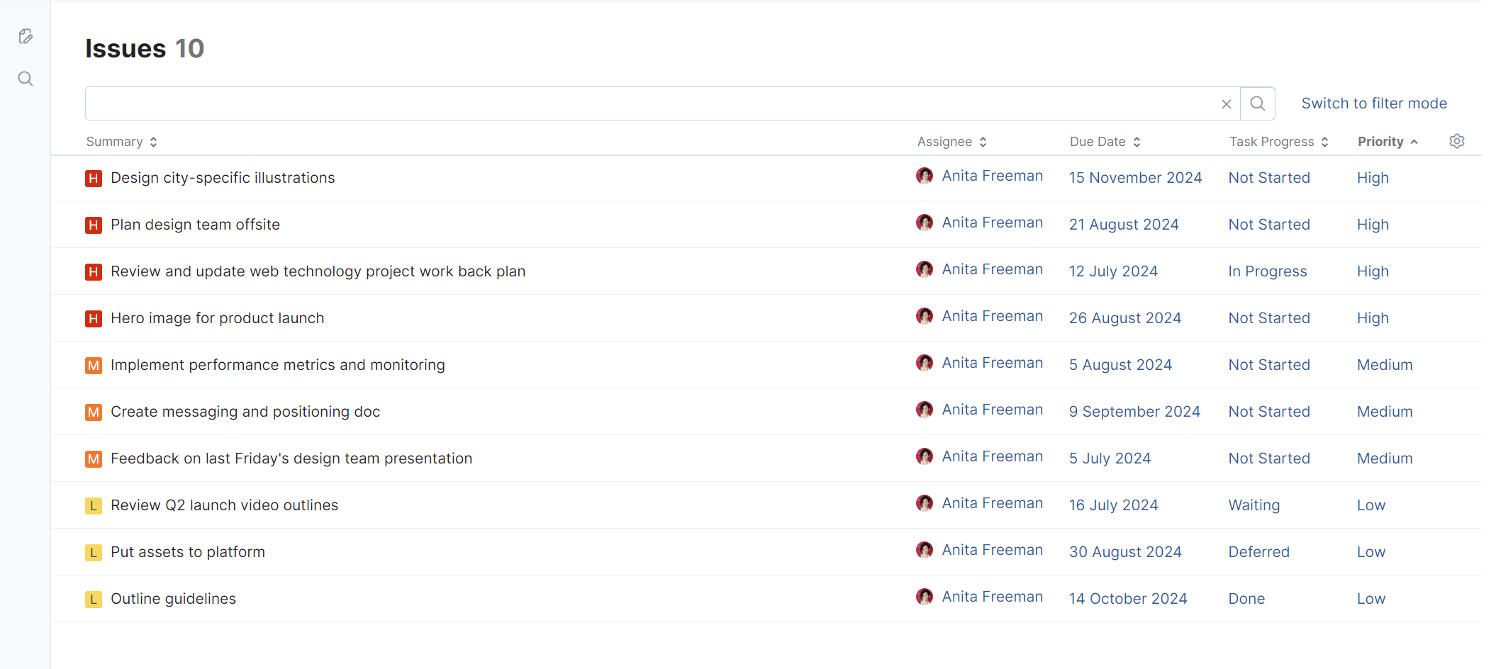 In addition to the agile board, here are a few additional views you can use to track your work: