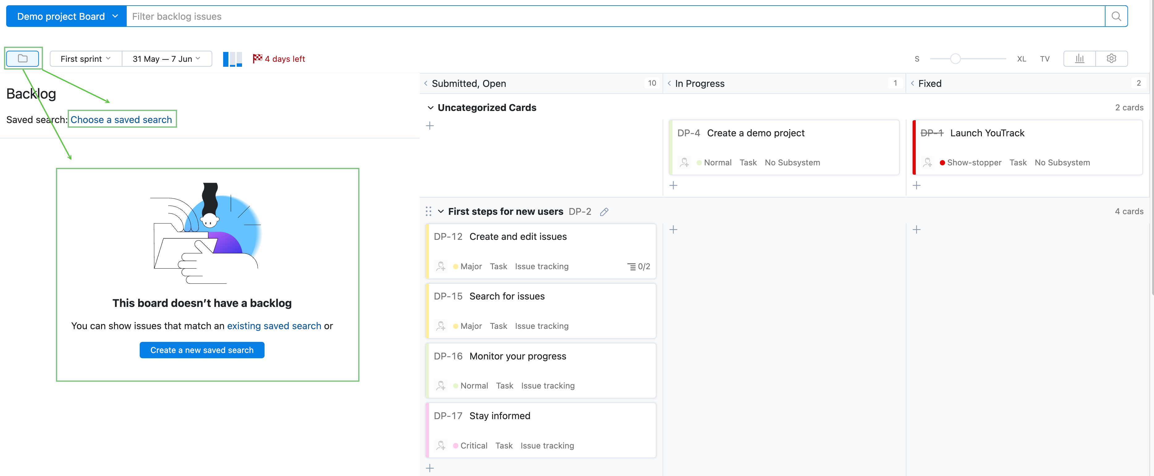 button to view the backlog.Click the View all Backlog issues in the Issues list icon located next to the saved search.