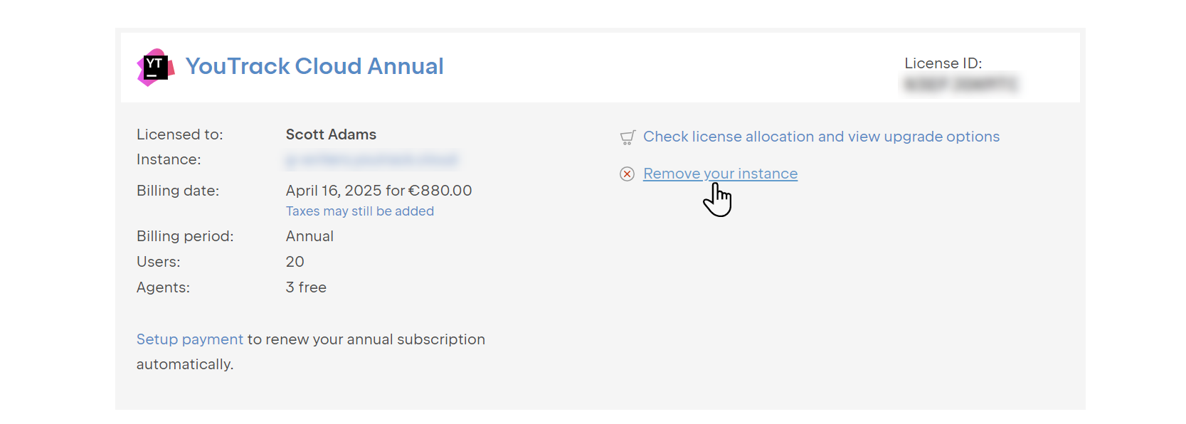 If you've been working with one of our free plans and no longer wish to continue working with YouTrack, you can also request that we remove the instance and delete its data.