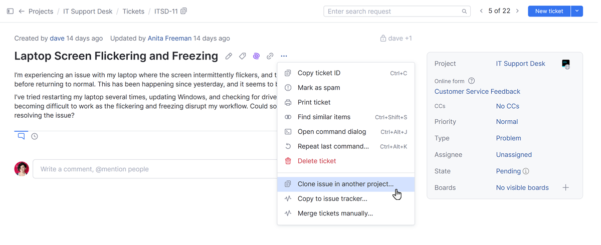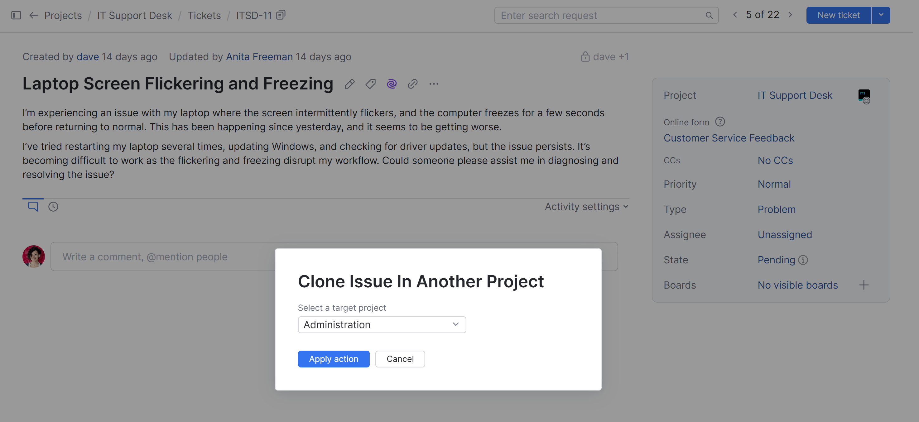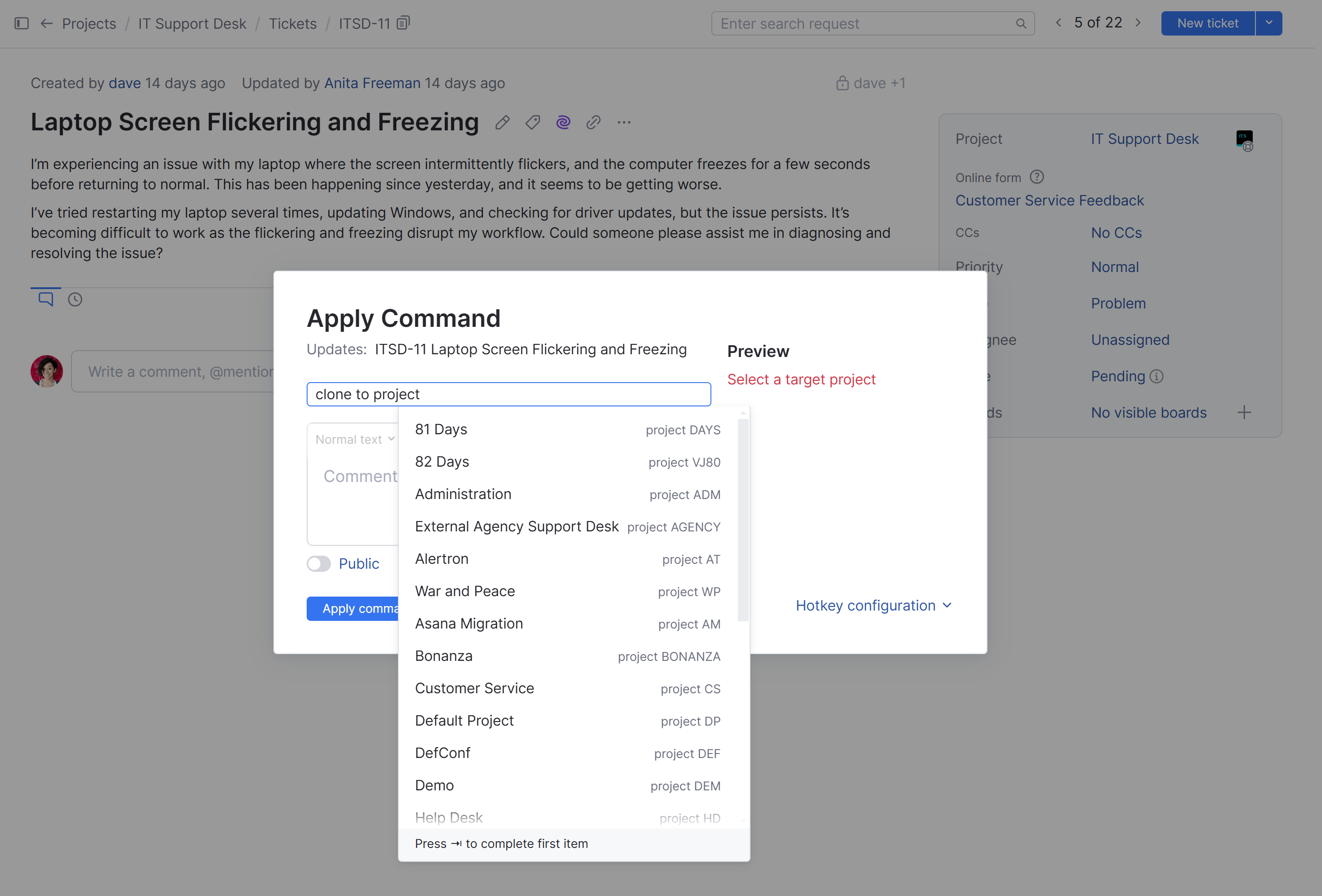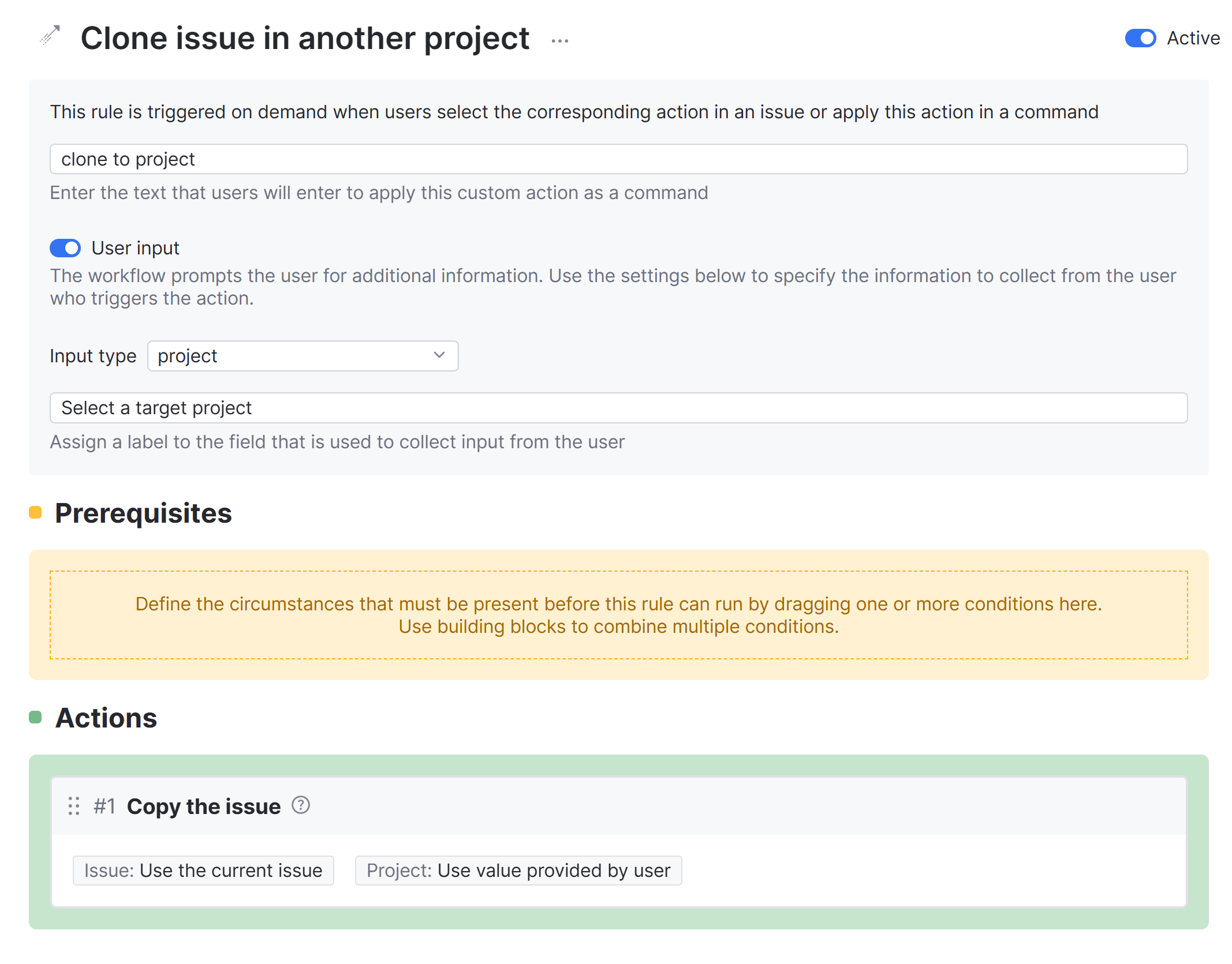 Action | The clone to project action can be applied as a command to issues when needed. |