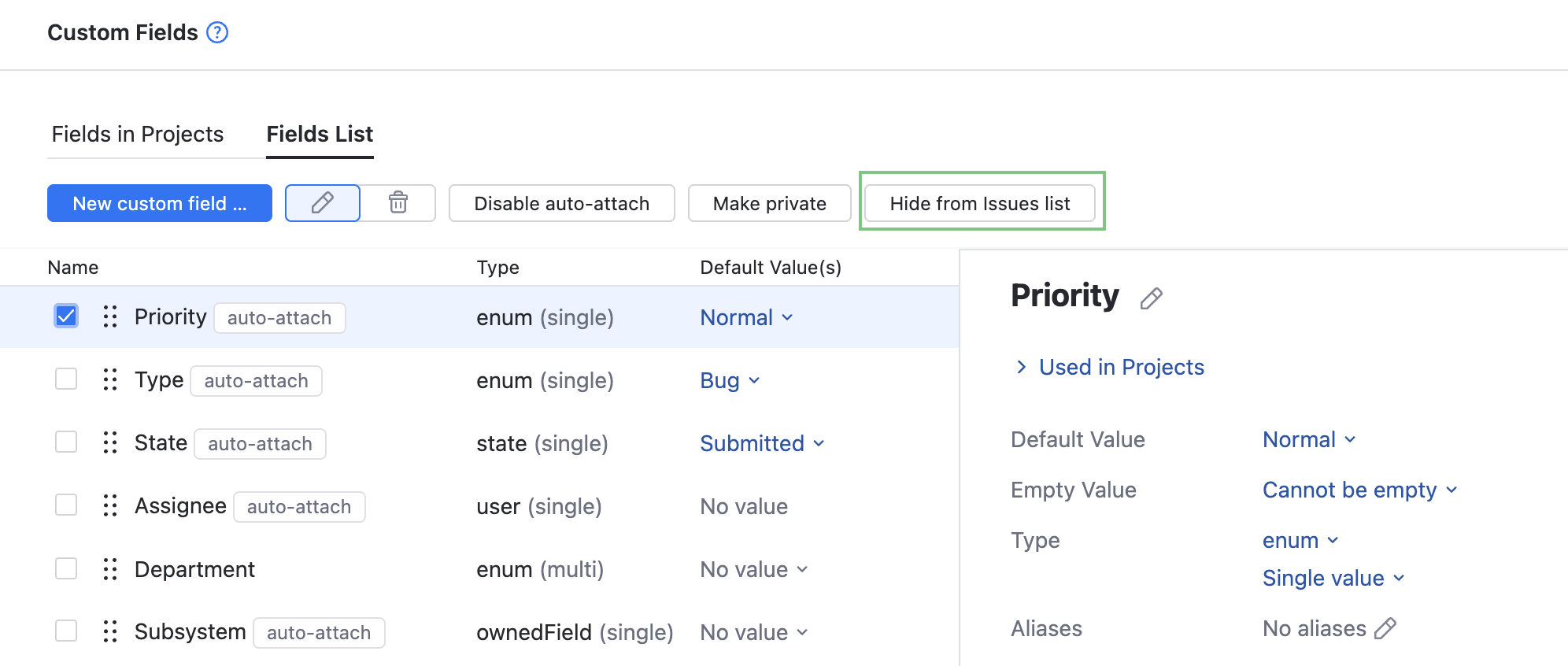 Whether a field is displayed in the Issues list. Custom fields are visible in the Issues list in compact and detailed views.