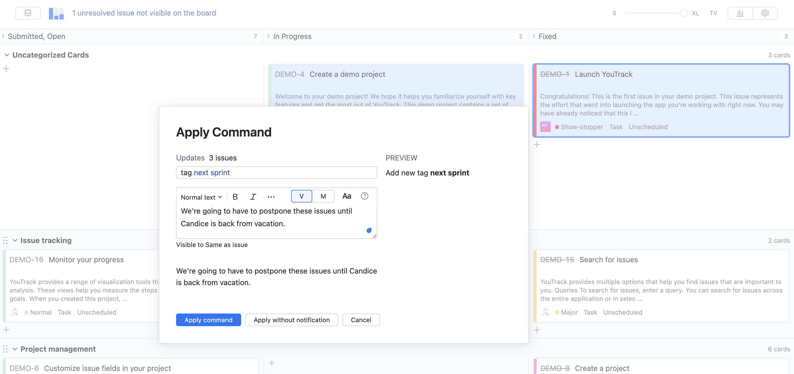 You can apply changes to multiple cards, for example, when you need to assign several tasks to the same assignee or set the same state. To do this quickly, use Space or Ctrl + click to select multiple cards and update them all at once. To enter the command, press Ctrl + Alt + J, or just start typing the command. When you start typing, the Apply Command dialog appears automatically.