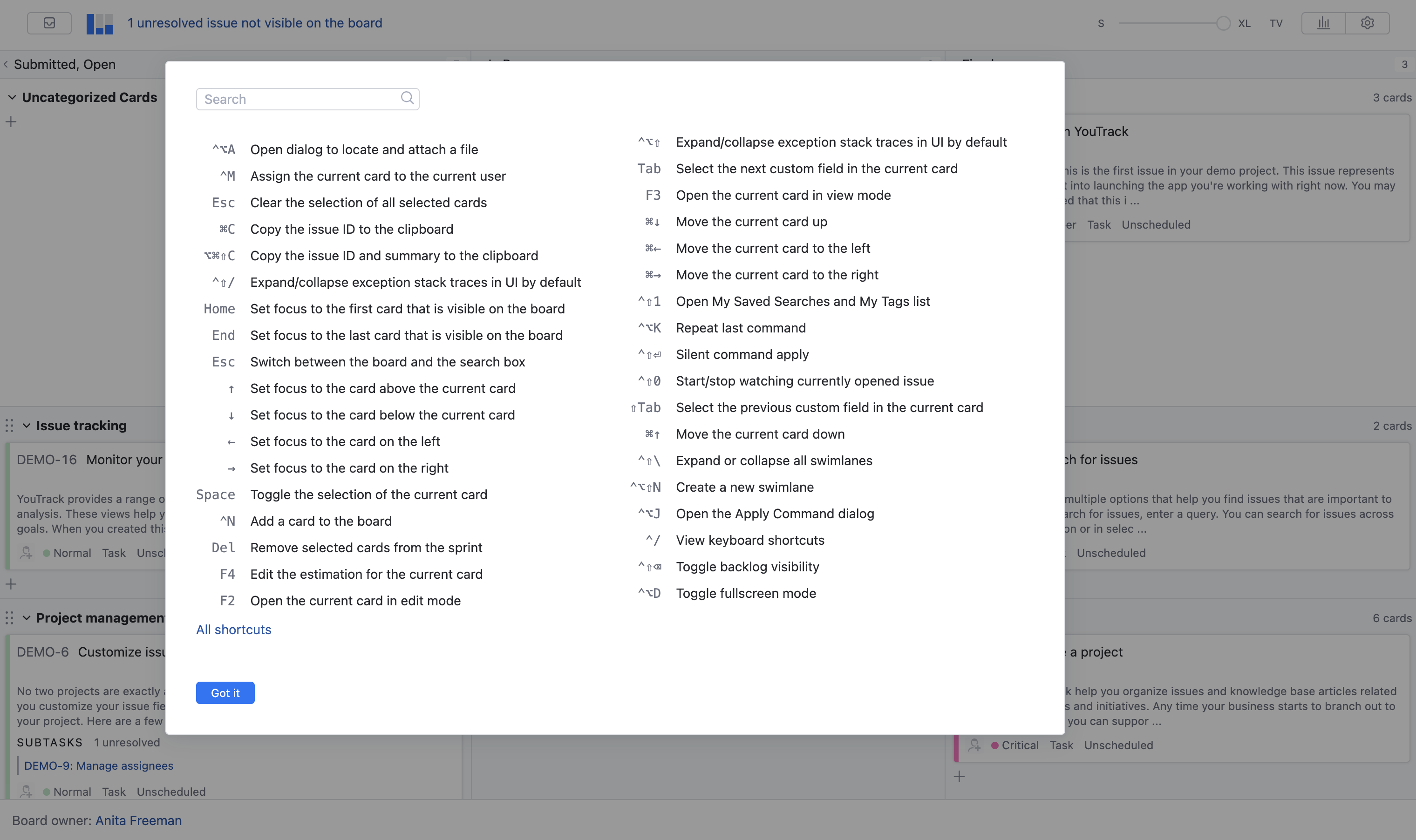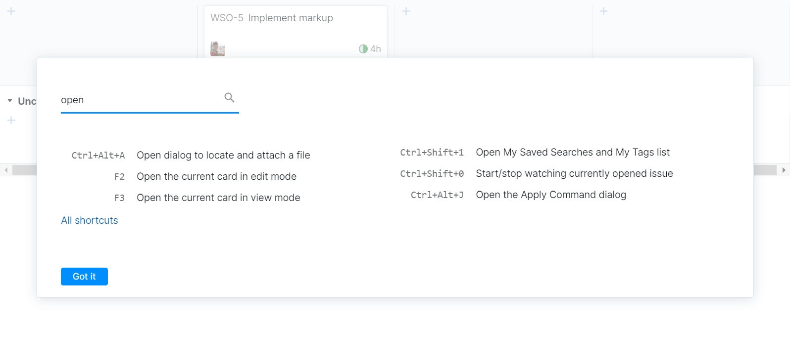 For a complete list, see Agile Board Keyboard Shortcuts.