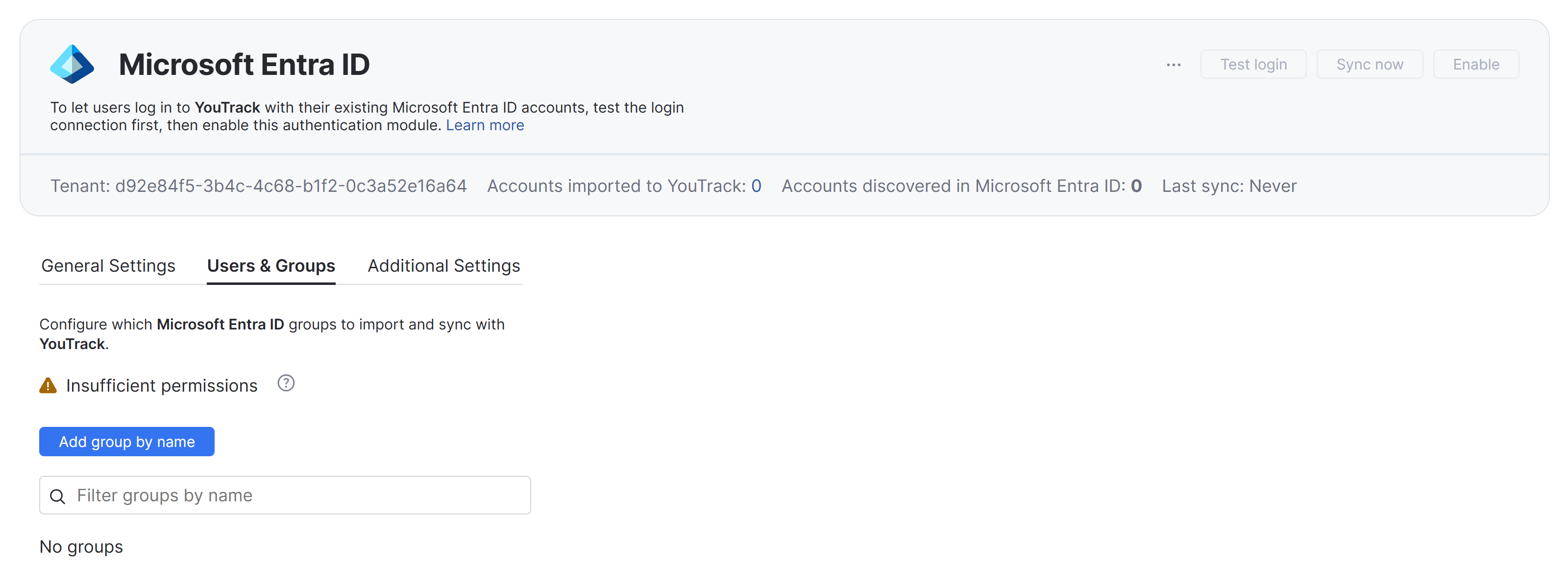 In case the necessary API permissions are not granted in Entra ID, you can provide the names of Entra ID groups to use in YouTrack manually.