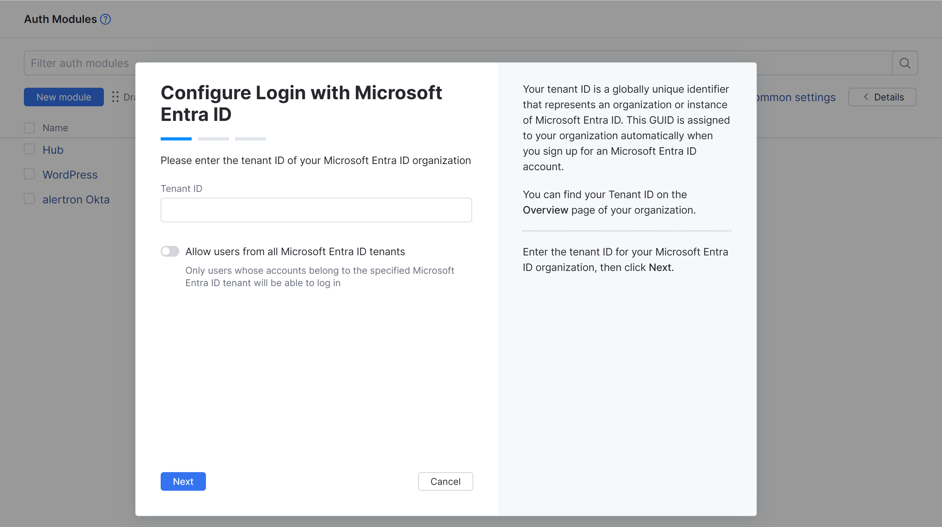 Tenant | Stores the ID of the custom tenant in the Microsoft Entra ID service. For auth modules that are connected to a common tenant, this field is empty. |