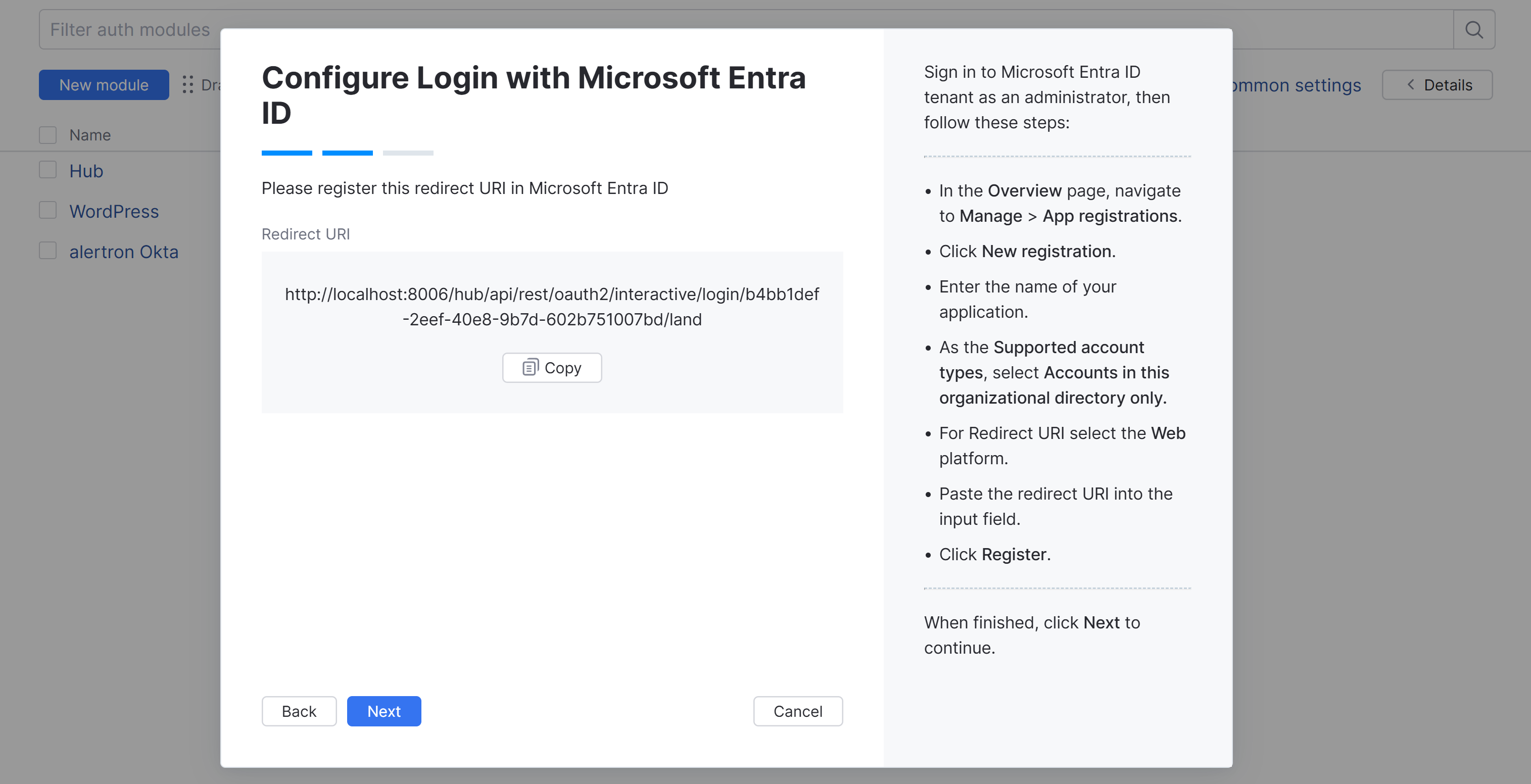 Set up a new Microsoft Entra ID authentication module as described on this page.