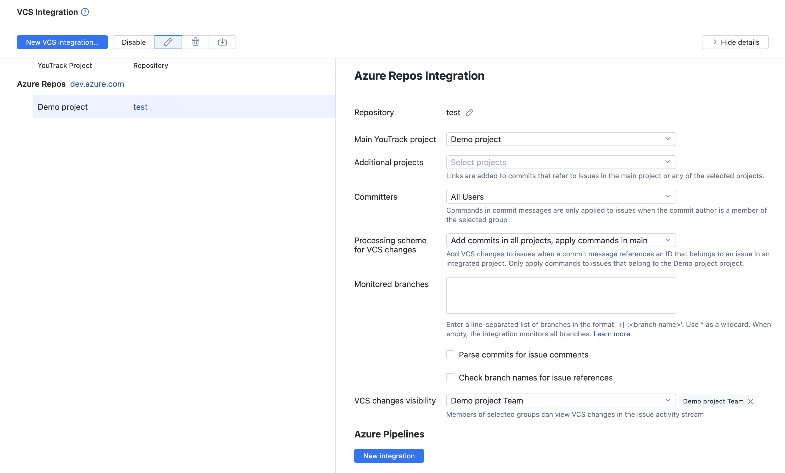 Your YouTrack project is integrated with the selected repository in Azure Repos.