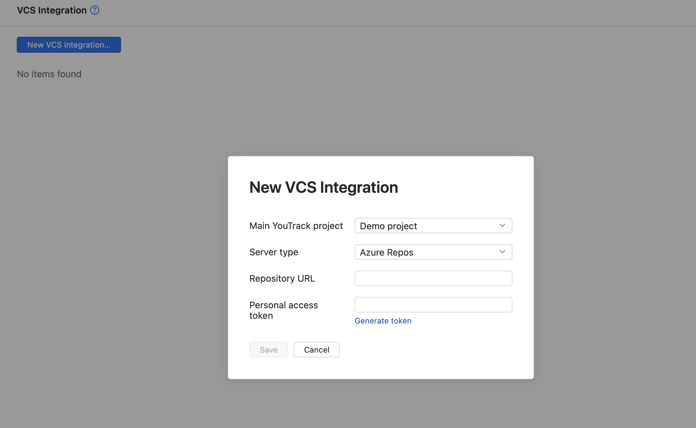 The first thing you should do is generate an access token in Azure DevOps. This token grants YouTrack access to the repository based on the access that is granted to your Azure account. You can use a single access token to set up multiple integrations.