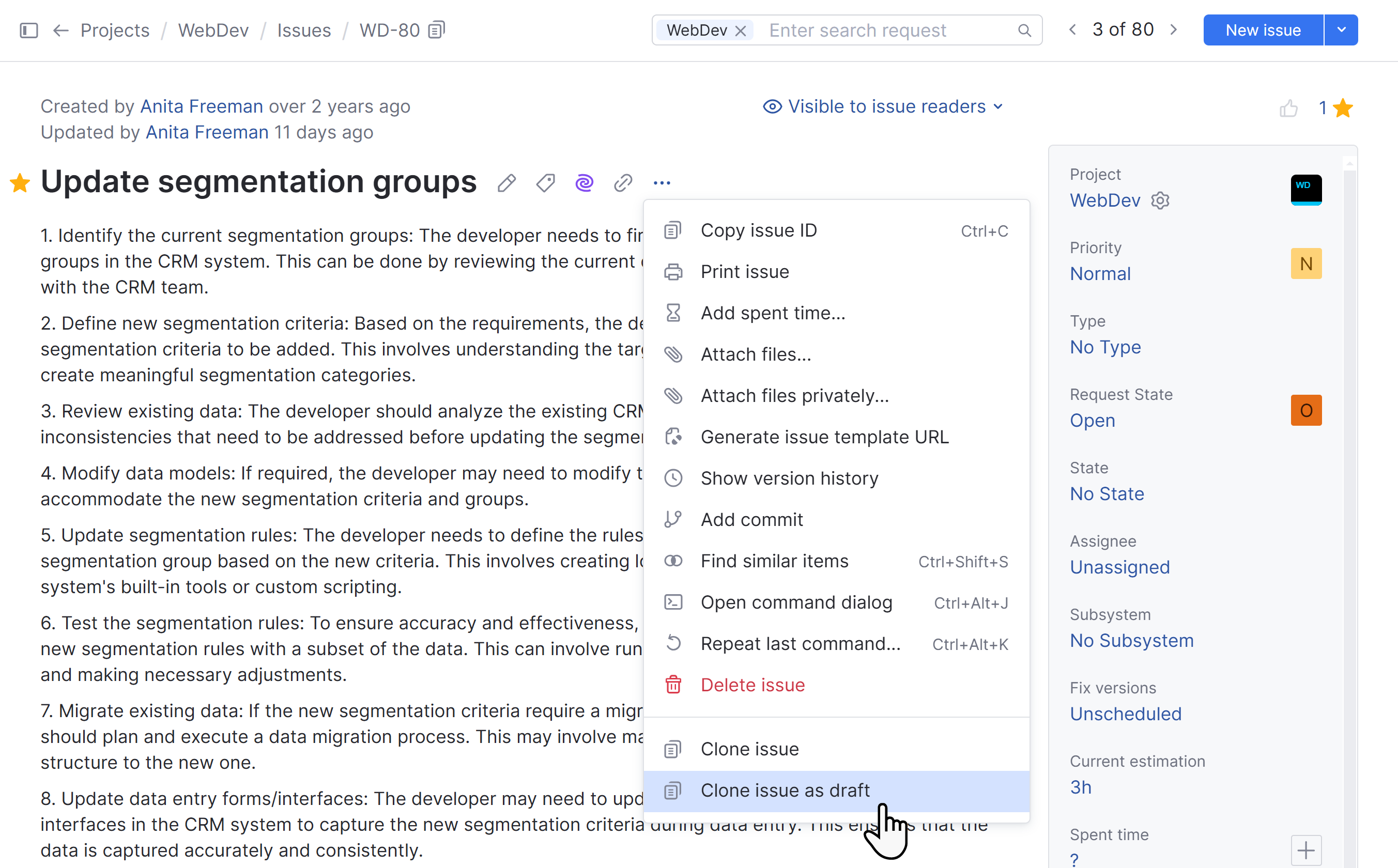 Clone issue as draft: works similarly to the Clone issue action, but creates a draft instead of reporting it immediately in the original project. You can locate these copies from Drafts menu when you create a new issue.
