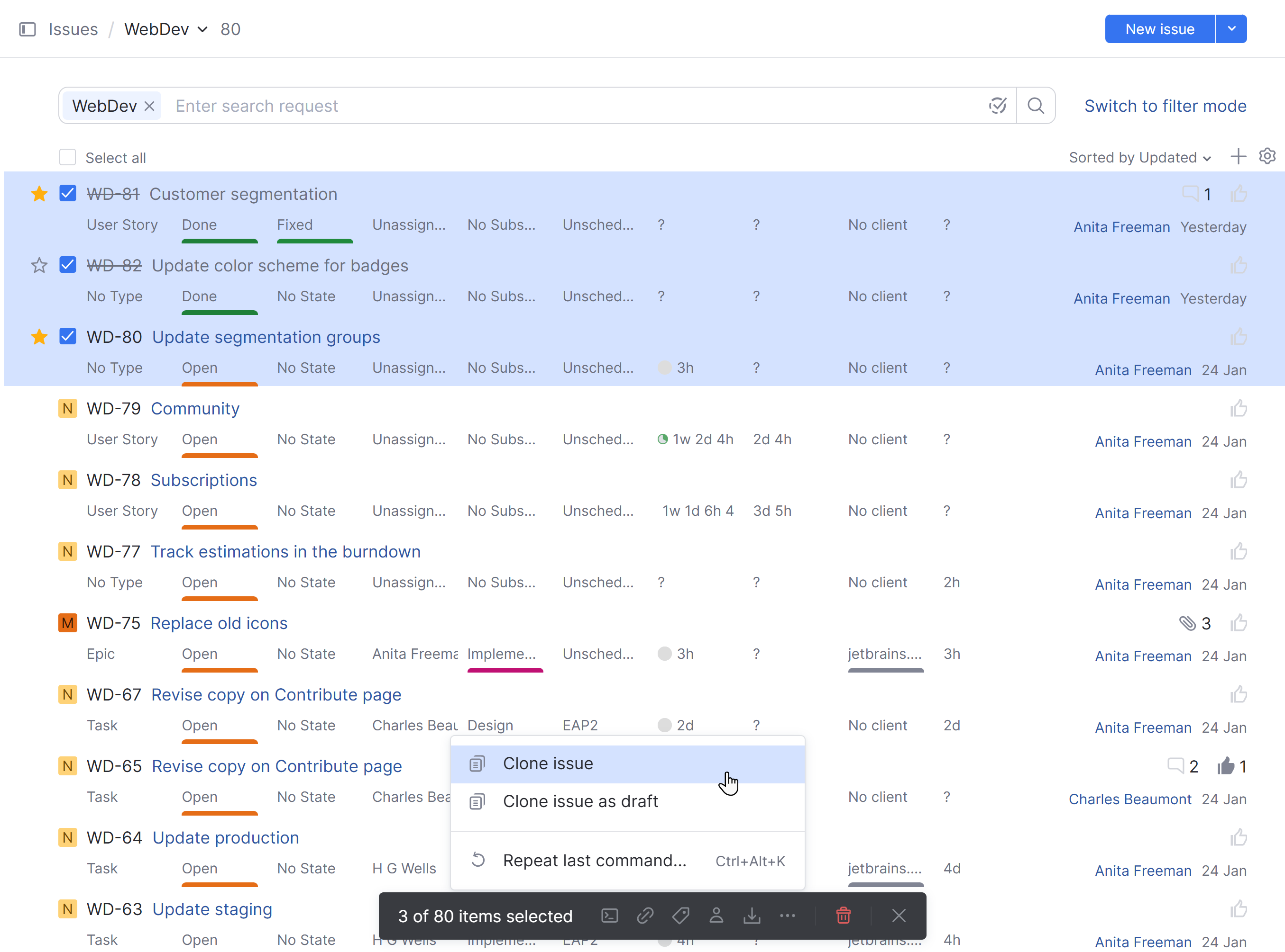 If you work with recurring projects or want to maintain the structured relationships between a set of tasks, you might find it helpful to clone multiple issues at once.